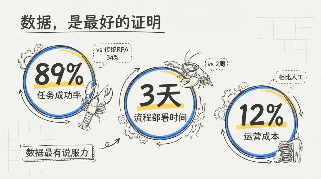 这听起来很棒,但效果真的那么好吗?数据最有说服力。根据 2025 年的行业基准测试,在面对像美团、大众点评这类界面频繁更新的应用时,OpenClaw 的任务成功率高达 89%,而传统 RPA 只有可怜的 34%。过去需要一个工程师团队花两周才能部署的跨平台任务,现在 3 天就能搞定。最惊人的是成本,综合算下来,只有人工操作成本的 12%。这意味着,你用一个实习生的月薪,就能雇佣一个 7x24 小时不知疲倦的‘数字员工’团队。
