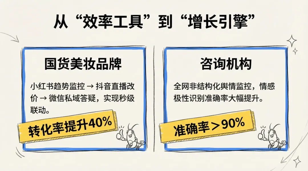 OpenClaw 带来的,早已不是简单的效率提升,而是业务模式的变革。一家知名的国货美妆品牌,用它打通了从“小红书发现趋势”,到“抖音直播间自动改价”,再到“微信私域用户维护”的全链路,实现了过去完全不敢想的秒级联动。一家顶尖咨询公司,则用它 24 小时监控全网的用户讨论,对复杂中文语境的情感判断准确率,比之前昂贵的爬虫方案高出了整整 40 个百分点。
