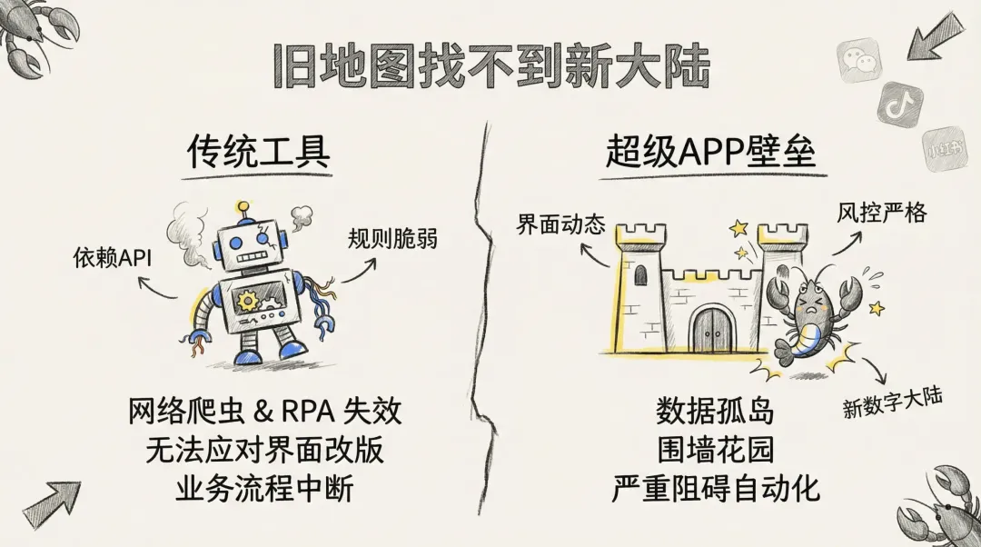 然而,现实是残酷的。传统的自动化工具,就像是拿着一张上个世纪的旧地图,试图在今天这个全新的数字大陆上航行。它们严重依赖固定的程序接口(API)和页面规则,但在微信、抖音这些APP频繁的界面更新和滴水不漏的风控体系面前,这些旧工具不堪一击,动不动就‘迷路’或被系统‘驱逐’,导致业务流程中断。