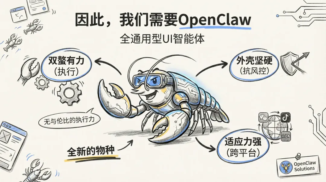 所以,我们需要的不是对旧工具的修修补补,而是一种全新的物种。这就是 OpenClaw 诞生的理由。它不是传统的机器人,我们称之为‘全通用型 UI 智能体’。我们用‘小龙虾’作为它的形象,因为它完美地诠释了 OpenClaw 的三大精髓:双螯强壮有力,代表无与伦比的执行力;外壳坚硬,能抵御各种复杂的风控;并且像小龙虾一样,拥有极强的生命力,能在任何数字水域——也就是任何 App 里——生存和作业。