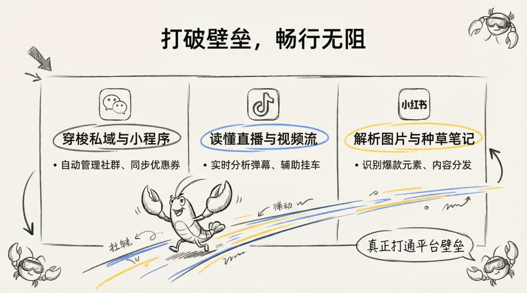 那么,这只神通广大的‘小龙虾’到底能帮我们做什么?想象一下:它可以帮你 7x24 小时自动管理上百个微信群的客户答疑;它能在抖音直播间里,实时看懂用户在弹幕里问的价格和库存,并提醒主播调整话术;它还能在小红书上,批量分析上千张爆款笔记的图片,告诉你最近什么样的构图和色调最容易‘出圈’。它真正打通了这些过去老死不相往来的平台。