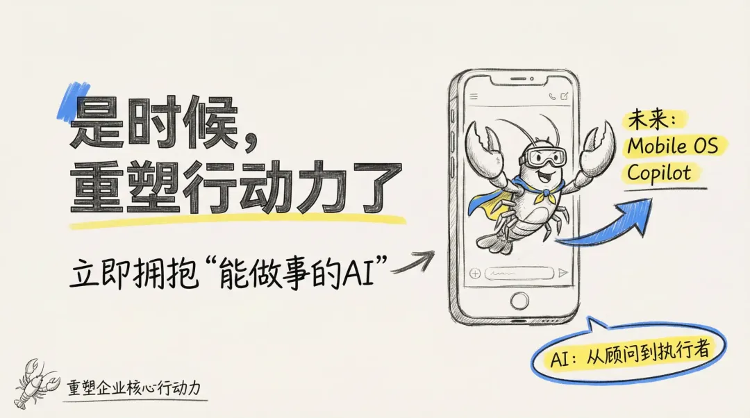 OpenClaw 的今天,是解放我们于跨平台操作的重复劳动。而它的明天,将进化成你手机里的‘操作系统副驾’,一个真正懂你、并能为你执行任何移动端操作的个人 AI 助理。对于在座的各位决策者和开发者来说,这意味着我们应该重新思考‘数字化转型’的真正含义了。不要再满足于仅仅‘看报表’的 AI,是时候拥抱‘能做事的 AI’,把AI从你的分析师,变成你最得力的行动小队。