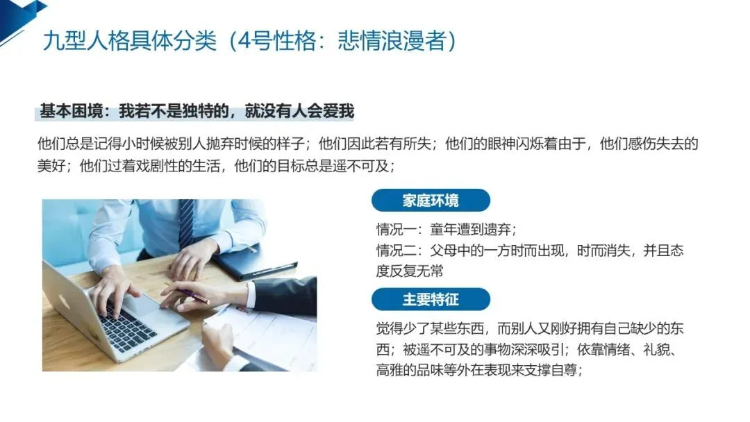4号悲情浪漫者 的基本困境是 “我若不是独特的,就没有人会爱我”,童年的被遗弃感让他们内心充满缺失感,对美与独特有着极致追求,共情能力强、善于感知他人痛苦是其闪光点,却容易沉溺负面情绪、追求遥不可及的目标。他们适合艺术、哲学、心理学等创造性工作,成长的重点是走出情绪内耗,关注当下的生活,将敏感的特质转化为创作的力量。