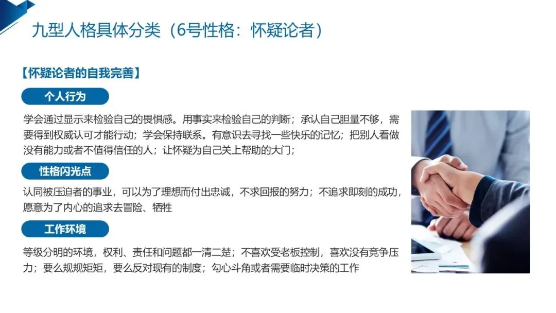 6号怀疑论者 的基本困境是 “我若不顺从,就没有人会爱我”,童年对权威的不信任让他们充满警惕,忠诚坚定、为理想执着付出、善于规避风险是其特质,却容易过度怀疑、焦虑,对他人的动机充满猜忌。他们适合等级清晰、责任明确的工作,成长的核心是用事实检验恐惧,建立对他人与世界的信任,学会放下过度的警惕。