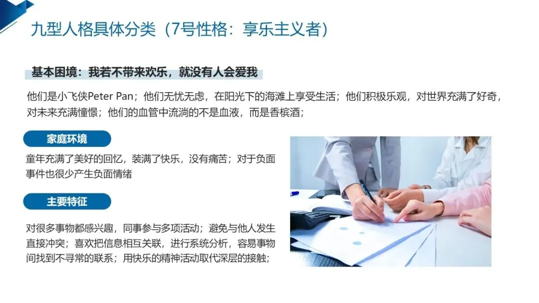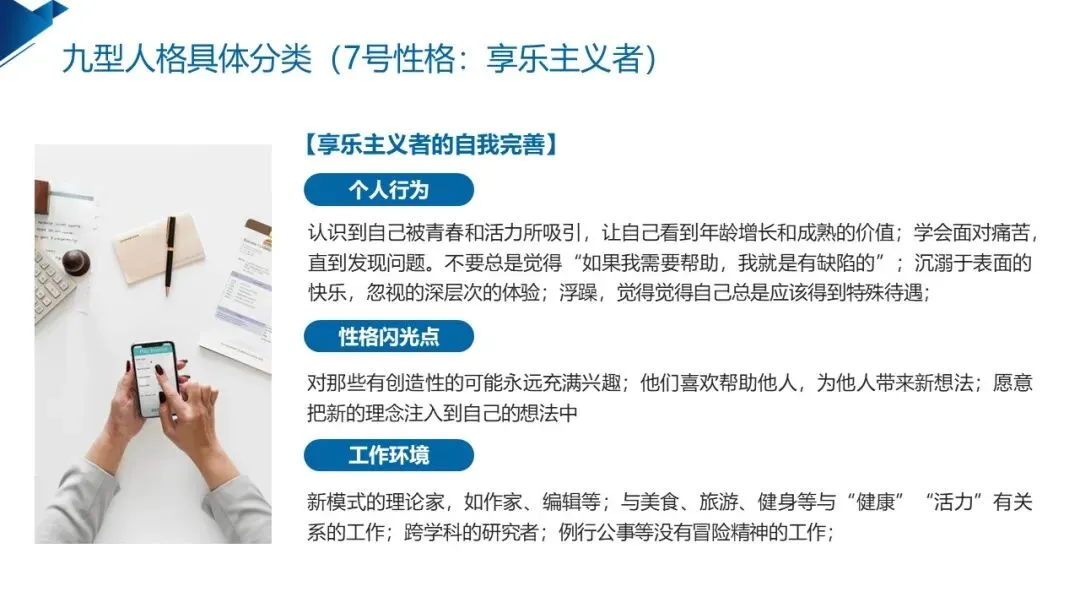 7号享乐主义者 的基本困境是 “我若不带来欢乐,就没有人会爱我”,童年的快乐体验让他们对生活充满憧憬,乐观积极、思维活跃、富有创造力是其闪光点,却容易逃避痛苦、浅尝辄止,难以深入做一件事。他们适合创意、策划、跨领域研究等工作,自我完善的关键,是学会直面痛苦与困难,培养专注力,在快乐中找到深度与沉淀。