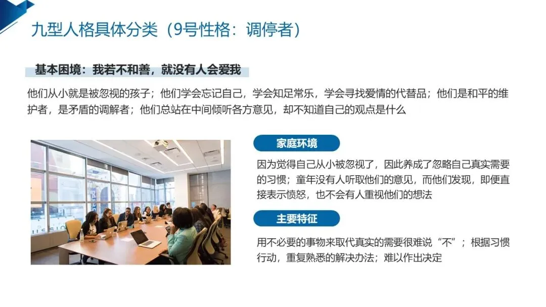 9号调停者 的基本困境是 “我若不和善,就没有人会爱我”,童年的被忽视感让他们习惯迎合他人,温和包容、善于倾听、调解矛盾是其优势,却容易失去自我、不愿表达立场,难以做出决策。他们适合行政、协调、后勤等需要稳定的工作,自我成长的关键,是学会正视自己的需求,勇敢表达观点,在和谐中保持自我的立场。
