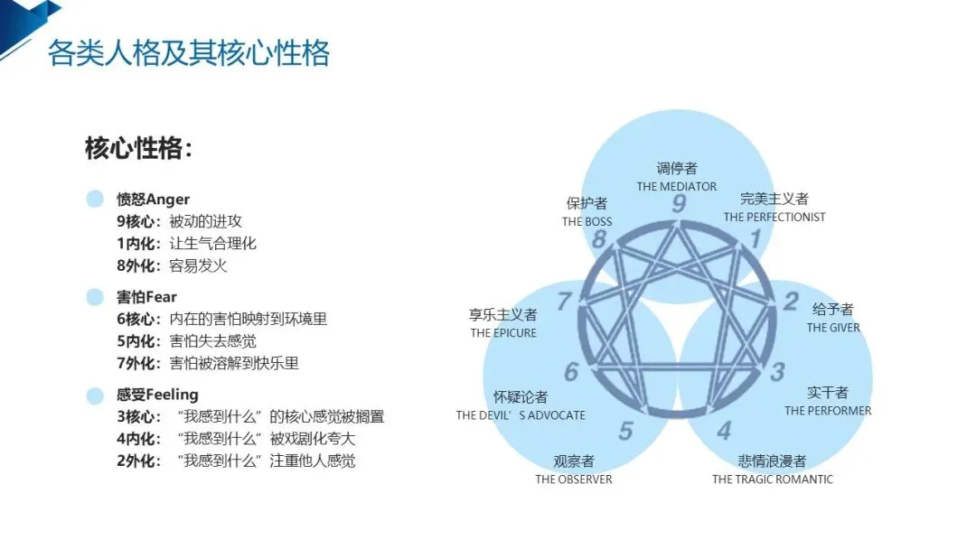 愤怒中心的 1 号完美主义者、8 号保护者、9 号调停者,被不同形式的愤怒所驱动,或内化愤怒苛求自己,或外化愤怒直面冲突,或被动愤怒逃避矛盾;害怕中心的 5 号观察者、6 号怀疑论者、7 号享乐主义者,因恐惧产生不同的防御机制,或远离人群囤积知识寻求安全感,或过度警惕怀疑一切,或追逐快乐逃避痛苦;感受中心的 2 号给予者、3 号实干者、4 号悲情浪漫者,对情感有着极致的感知,或向外付出寻求认可,或搁置感受追求成就,或放大情绪追求独特。