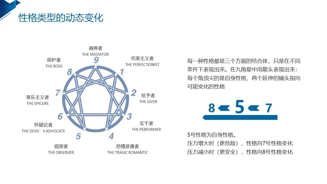 比如 5 号观察者,压力大时会向 7 号享乐主义者转变,试图用快乐逃避焦虑;安全时则会向 8 号保护者靠拢,展现出坚定与果敢的一面。