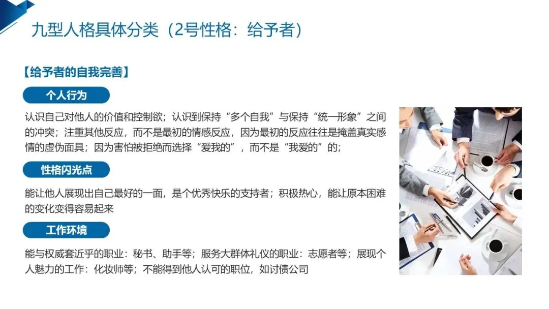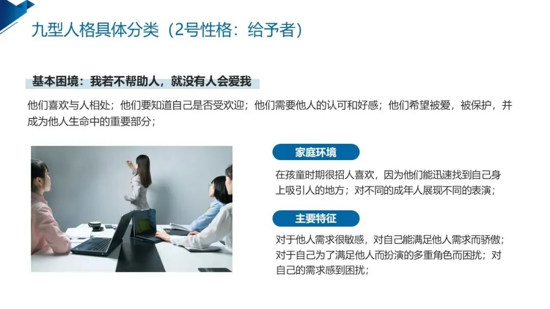2号给予者 的基本困境是 “我若不帮助人,就没有人会爱我”,童年的被认可感来自于取悦他人,让他们对他人的需求极度敏感,热心积极、善于支持他人是其优势,却常常忽略自身需求,在付出中迷失自我。他们适合服务型、社交型的工作,成长的核心是建立健康的边界感,学会正视自己的需求,实现助人与自爱的平衡。