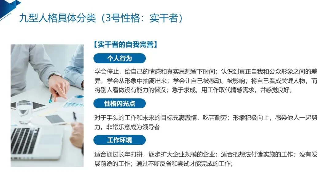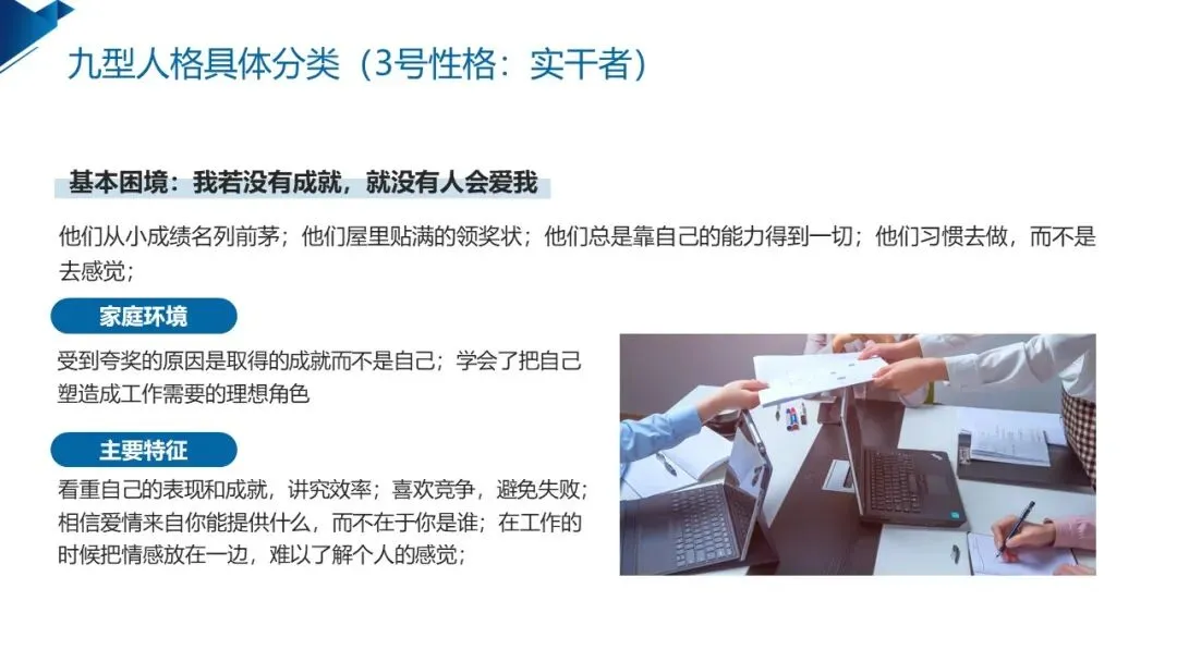 3号实干者 的基本困境是 “我若没有成就,就没有人会爱我”,童年的夸奖源于成就而非本身,让他们成为追求成功的 “行动派”,吃苦耐劳、充满激情、善于引领团队是他们的特质,却习惯用成就定义自我,压抑内心的真实感受。他们适合需要开拓、执行、引领的工作,自我完善的关键,是剥离 “成就面具”,看见真实的自己,给情感留足表达的空间。