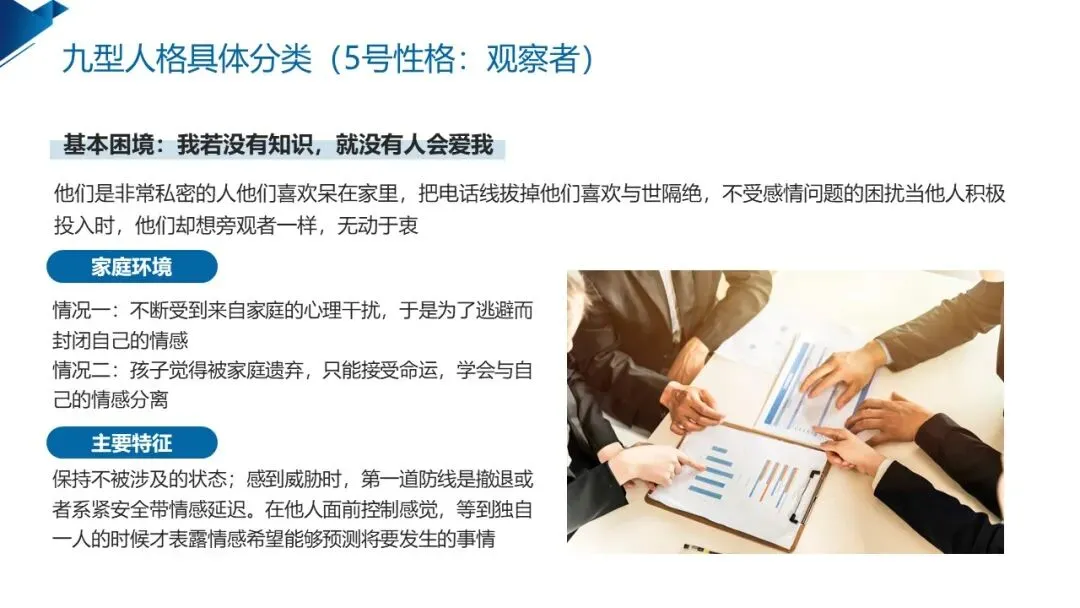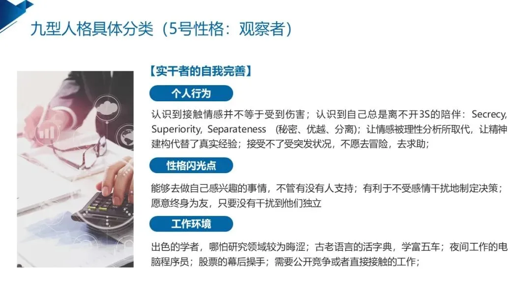 5号观察者 的基本困境是 “我若没有知识,就没有人会爱我”,童年的情感隔离让他们习惯用知识构建安全感,冷静理性、专注钻研、善于独立思考是其优势,却常常远离人群、压抑情感,害怕与人深度接触。他们适合科研、编程、幕后分析等需要独立思考的工作,自我成长的关键,是打破情感隔离,学会主动建立情感连接,明白知识并非获得爱的唯一途径。