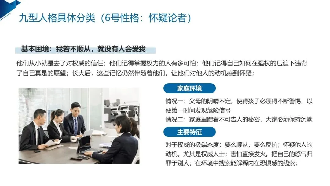 6号怀疑论者 的基本困境是 “我若不顺从,就没有人会爱我”,童年对权威的不信任让他们充满警惕,忠诚坚定、为理想执着付出、善于规避风险是其特质,却容易过度怀疑、焦虑,对他人的动机充满猜忌。他们适合等级清晰、责任明确的工作,成长的核心是用事实检验恐惧,建立对他人与世界的信任,学会放下过度的警惕。