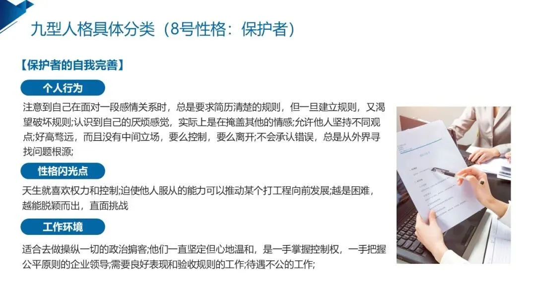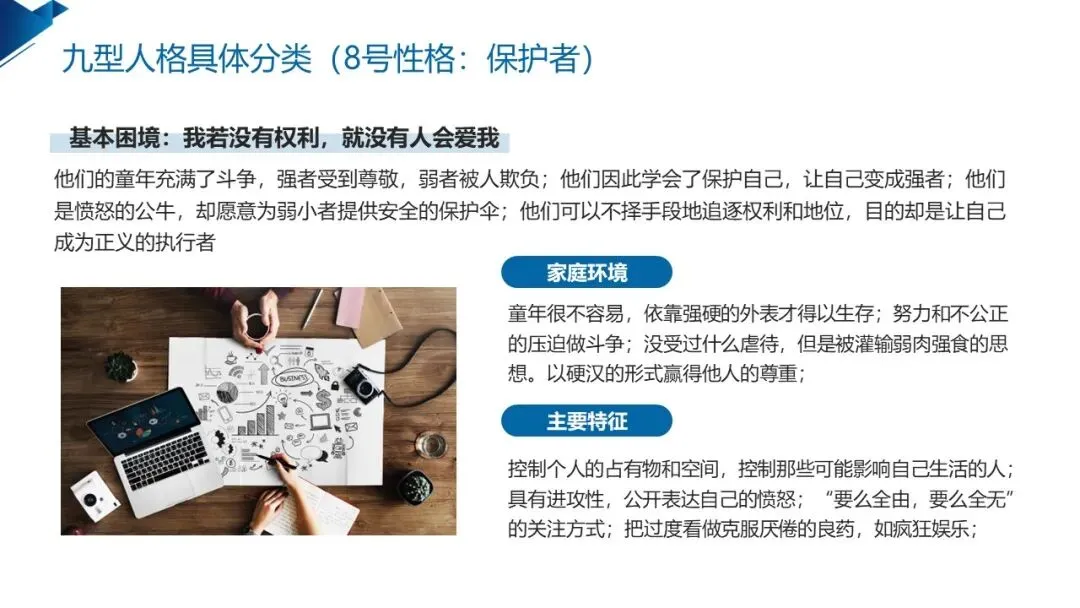 8号保护者 的基本困境是 “我若没有权力,就没有人会爱我”,童年的斗争经历让他们养成了强硬的性格,果敢坚定、敢于担当、保护弱小是其特质,却容易控制欲过强、易怒,不愿承认自己的脆弱。他们适合领导、管理、维权等需要魄力的工作,成长的重点是软化强硬的外壳,学会示弱与授权,将力量用在守护而非支配上。