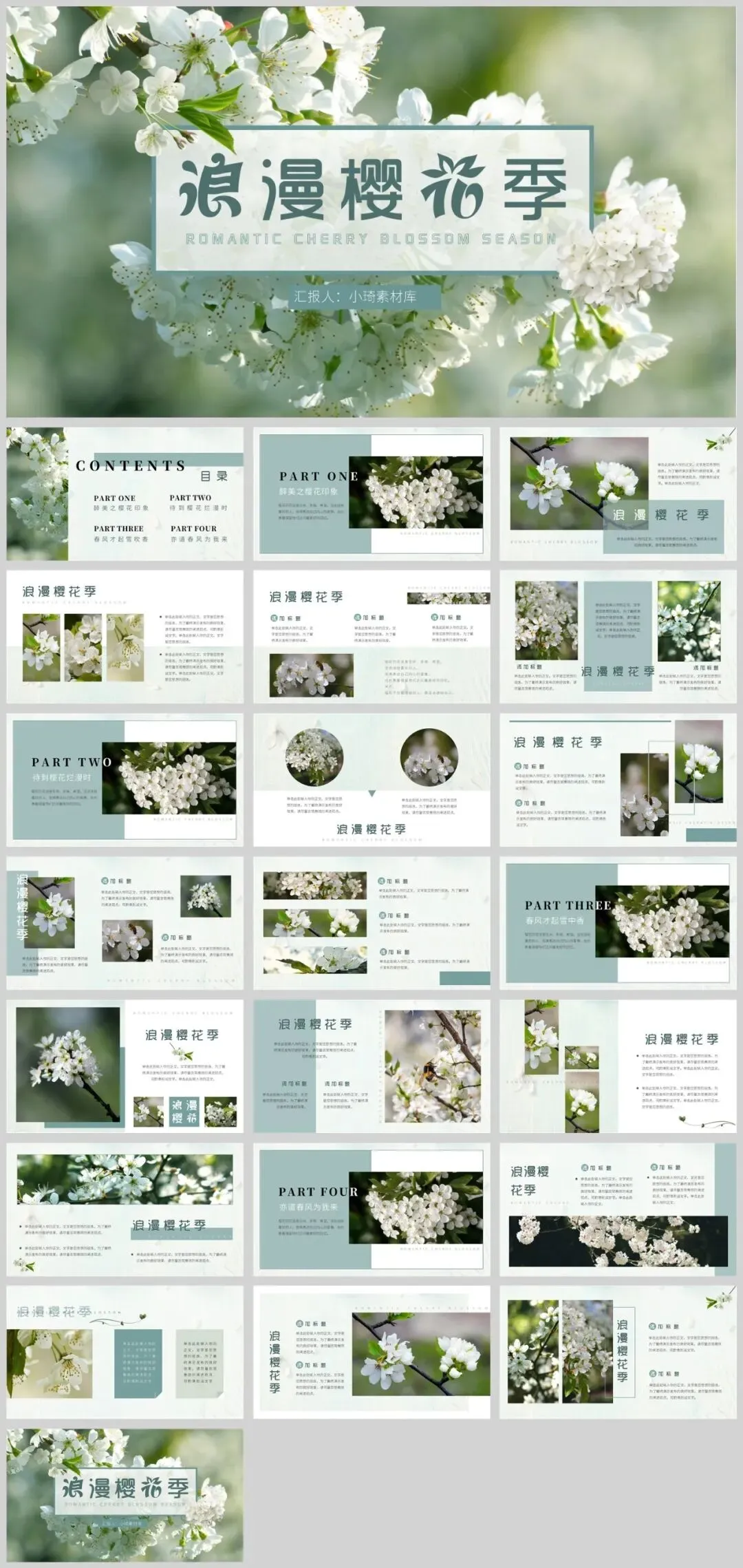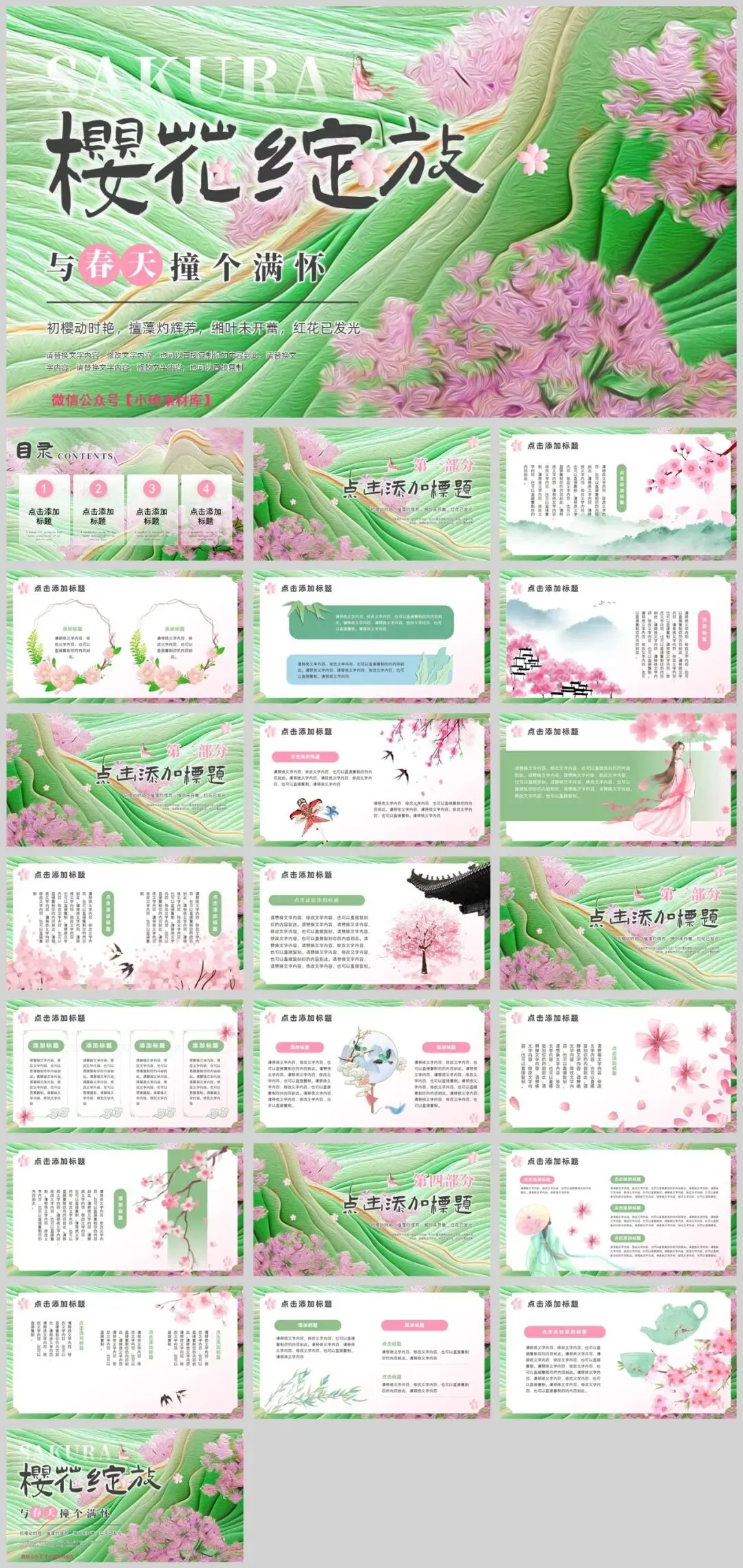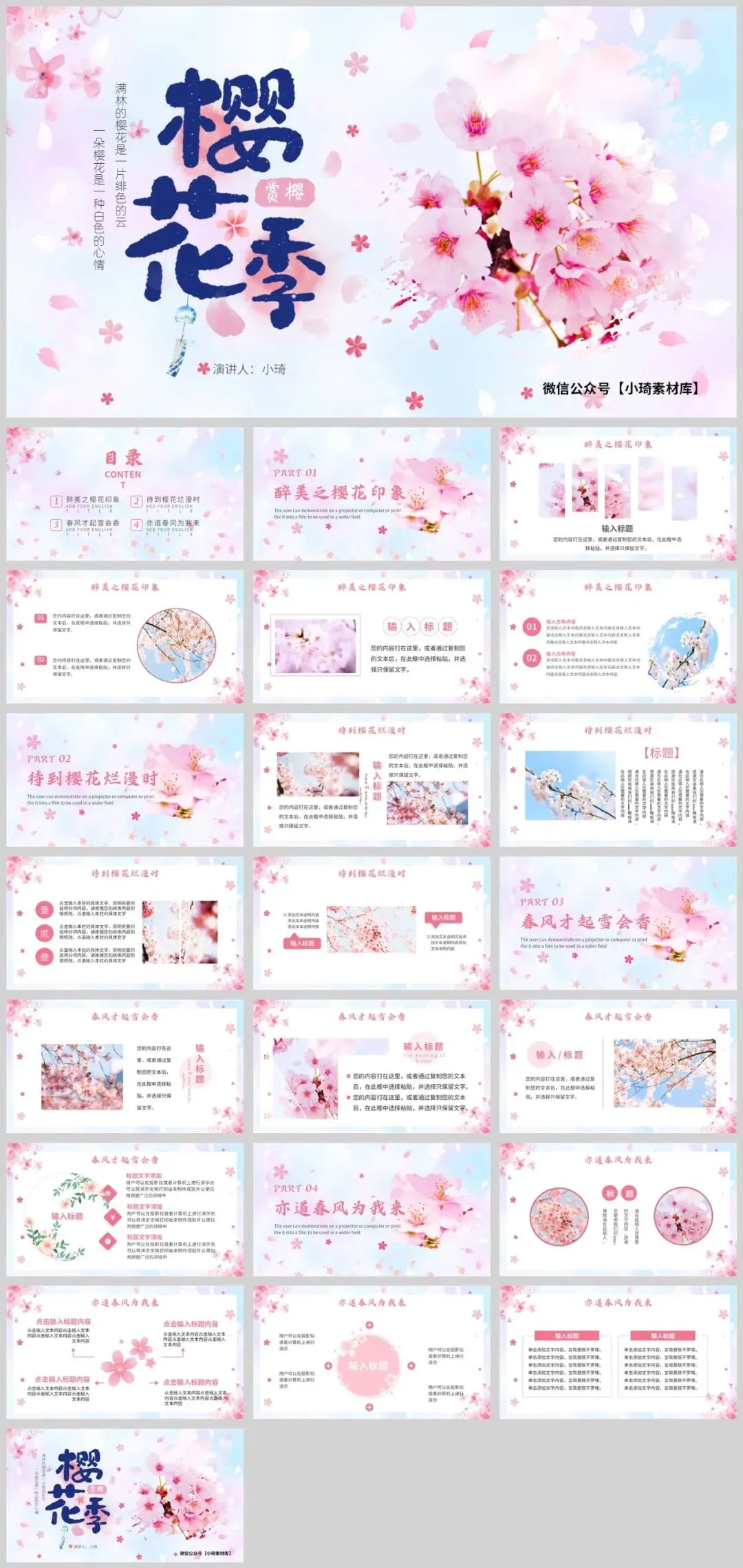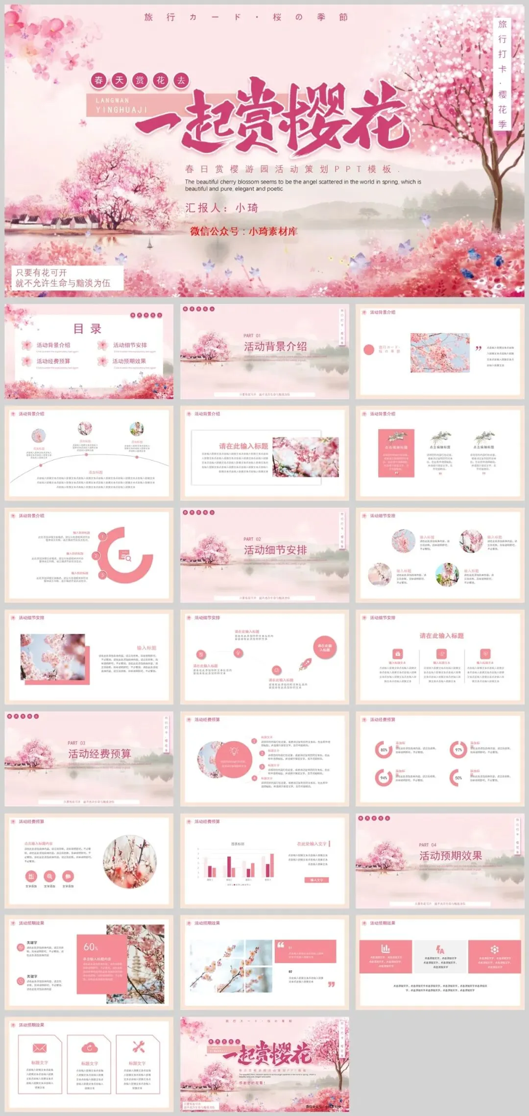 春日的微风拂过,武汉大学樱花大道上,百万游客共赴这场春天的约会。樱花,这一自然界的浪漫符号,正以惊人的力量点燃人们心中的诗意与向往。一期独具匠心的浪漫樱花主题PPT模板,都能让你的内容在视觉盛宴中脱颖而出,成为传递情感与记忆的绝佳载体。内容太多了,就不一一展示了,一共有25套,个个都好看,太养眼了!会员获取资源地址:http://yanwu.czwk.xyz/ 小琦素材库是一个学习技能的平台,在这里已经聚集了超过3万好学上进的小伙伴,每天一起学习成长!我们要做的是用心整理优质的学习资源,而你只需要负责好好学就行了,希望你在这里每天都有收获。置顶“小琦素材库”,让我们一起疯狂成长。