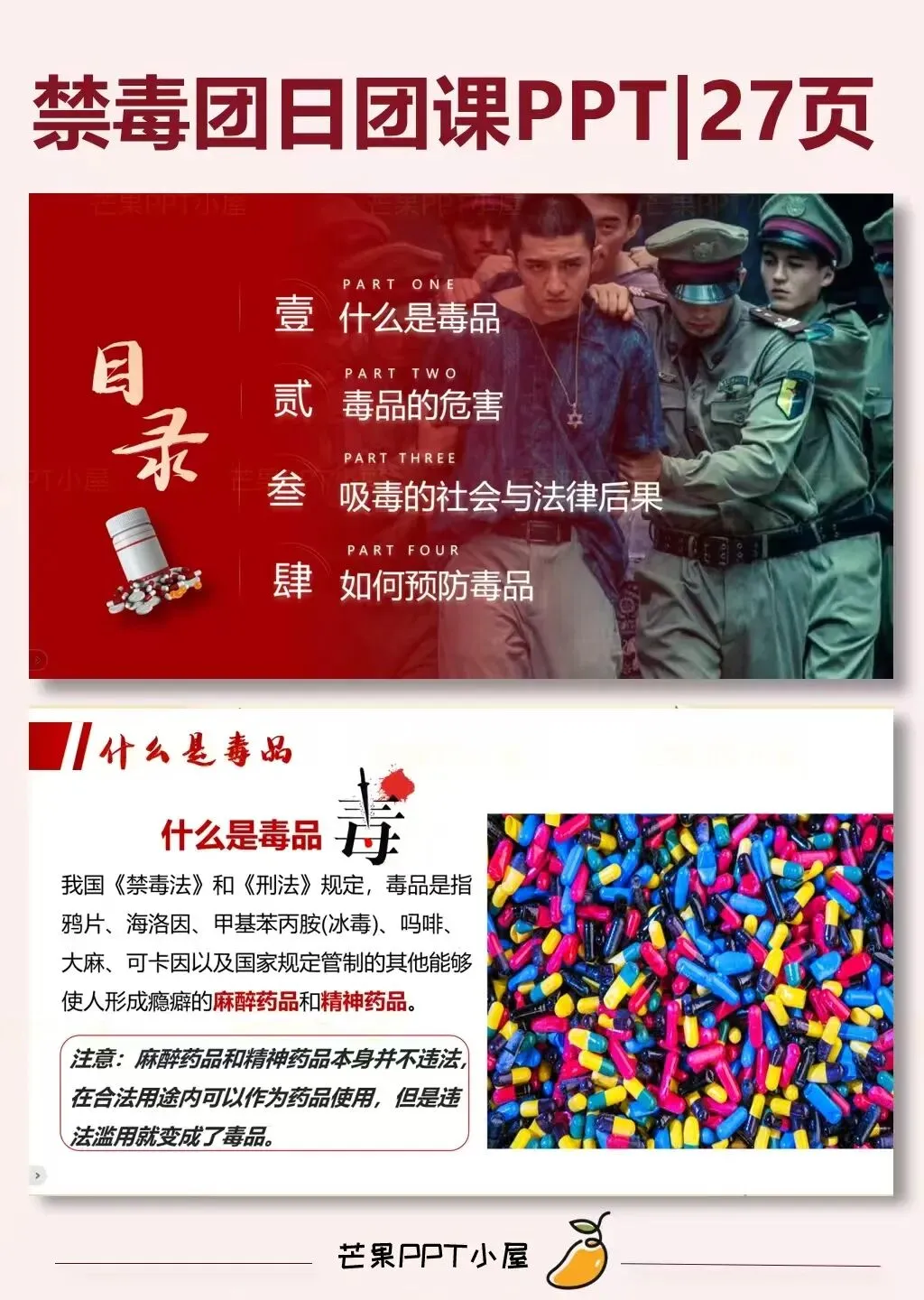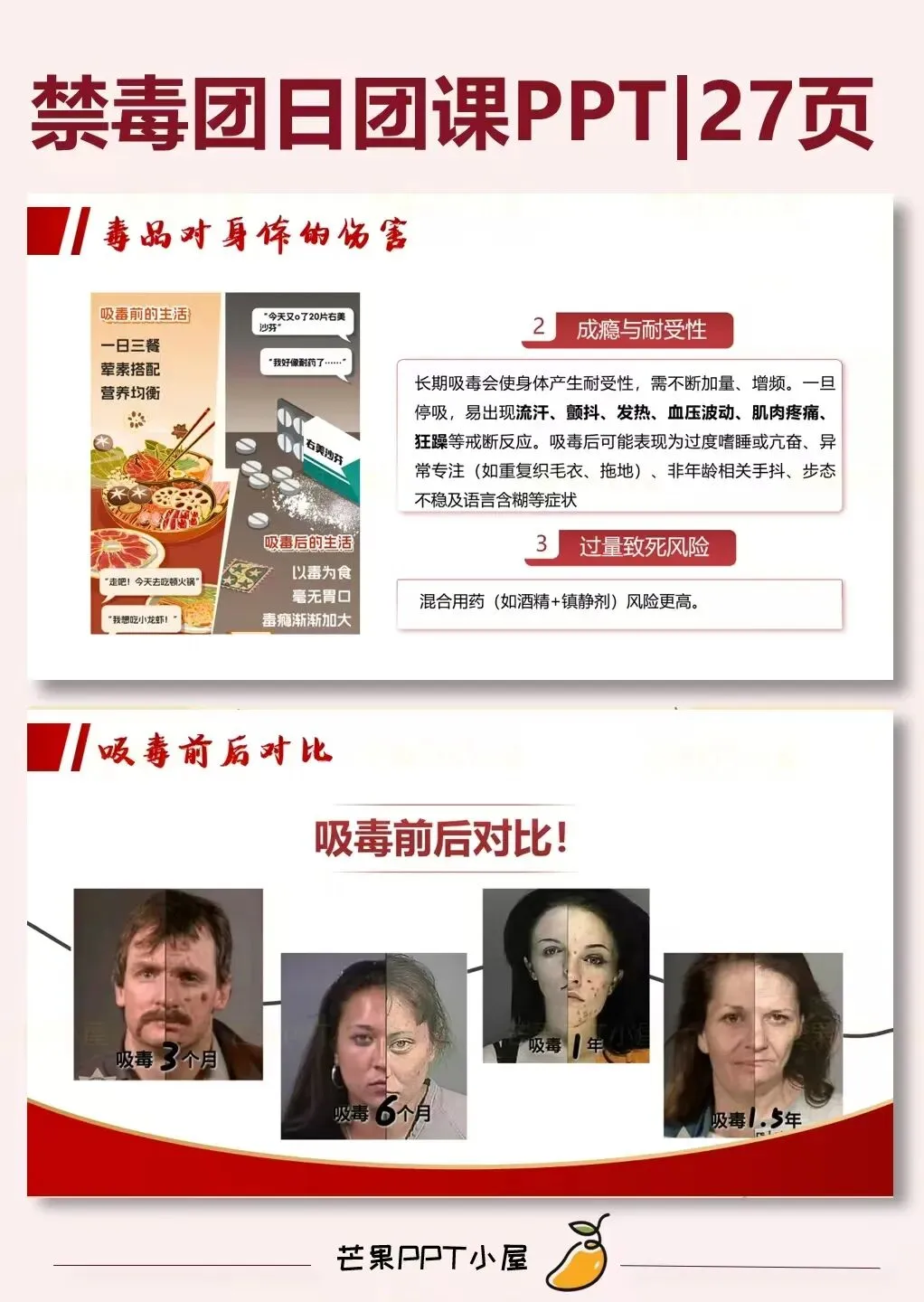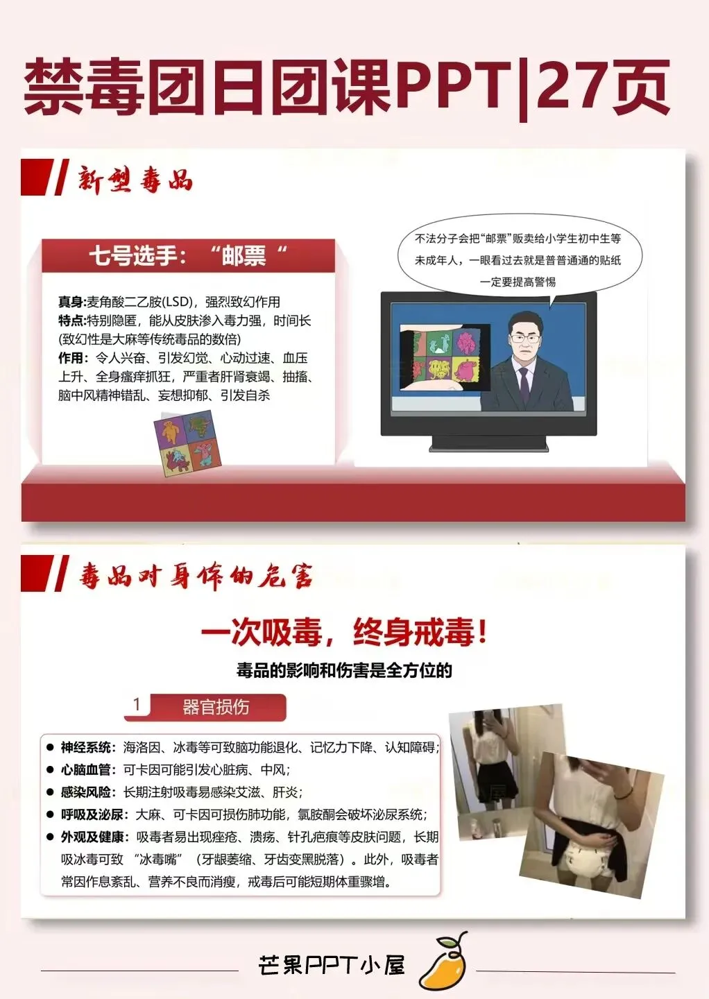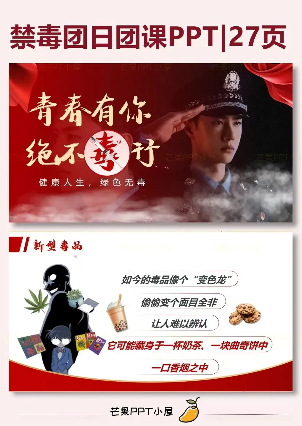 • 页数:ppt共27页• 内容素材:内含一个一分半视频• 适用场景:可用于国际禁毒宣传日,禁毒知识科普,禁毒班会,禁毒相关主题班会或主题讲座等等!!