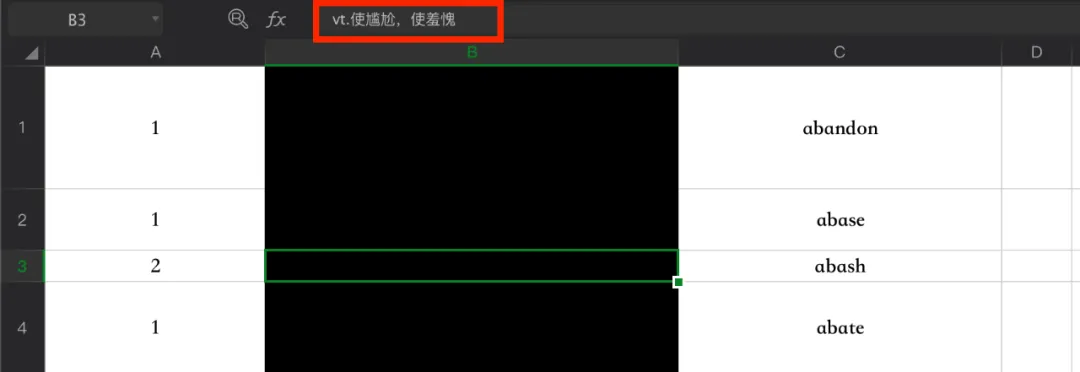 使用核桃在上文中教大家的熟悉度排序法,在A列填写数字,快速筛选出不熟悉的单词,并为其降序排序。