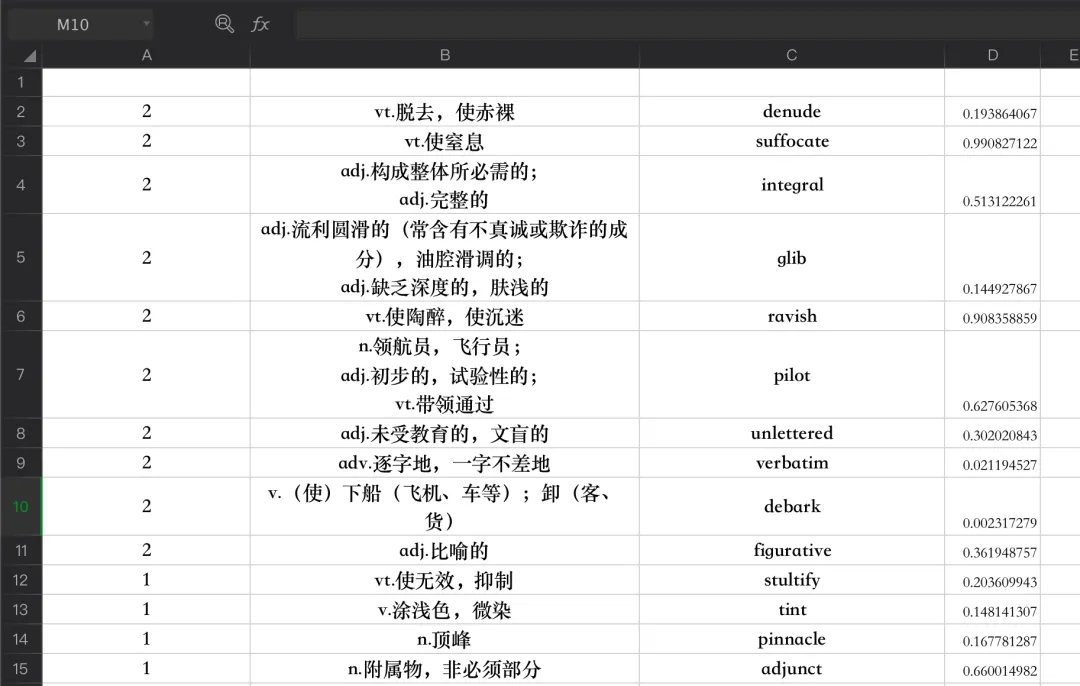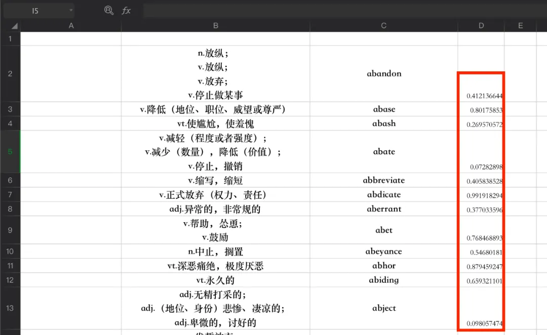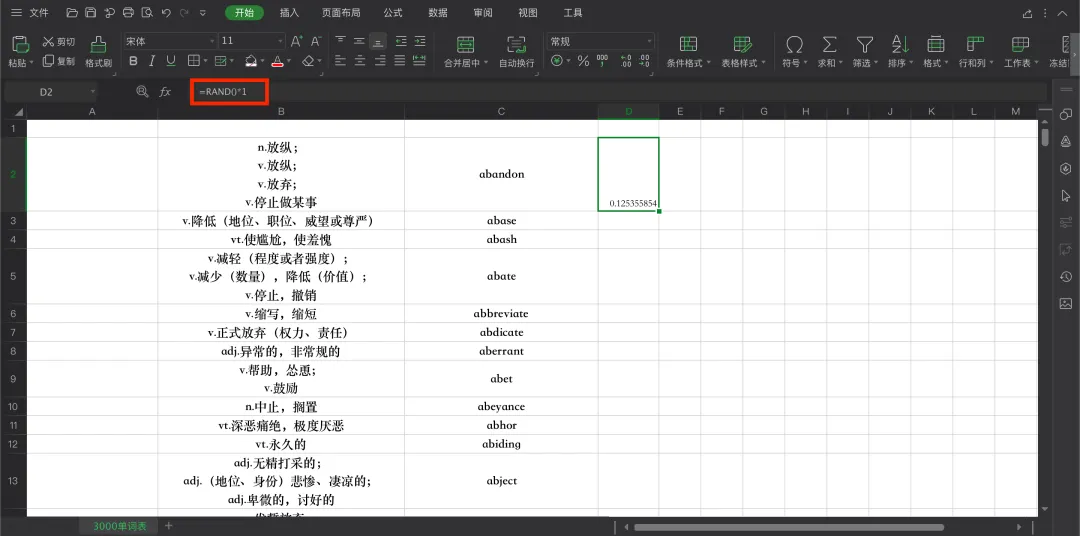 打开你的单词表,同样将第一列空出,并在单词右侧的空白单元格(在本文的示范中为D2)中输入函数公式“=RAND()*1”。这个函数会随机生成一个0-1之间的数字。