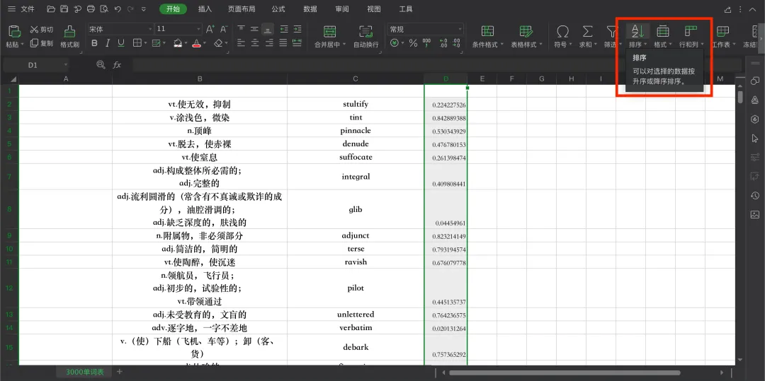 选择D列,使用“排序”功能,一个随机排序的单词表就做好啦!