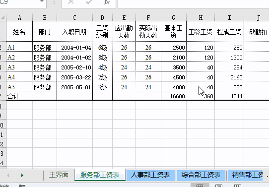 =VLOOKUP(A2,INDIRECT(LOOKUP(1,0/COUNTIF(INDIRECT({"销售";"服务";"人事";"综合";"财务"}&"!a:a"),A2),{"销售";"服务";"人事";"综合";"财务"})&"!a:g"),7,0)