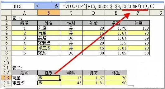 在表二中,根据姓名从表中查询对应信息
