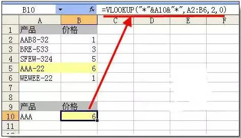 =VLOOKUP("*"&A10&"*",A2:B6,2,0)