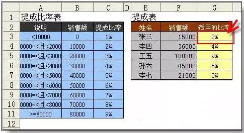 根据左表的提成比率表,在右表中更具销售额在G列查找适用的比率