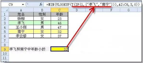 =MIN(VLOOKUP(T(IF(1,{"李飞","南宁"})),A2:C6,3,0))