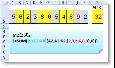 {=SUM(VLOOKUP(A2,A2:K2,{2,3,5,6,8,9},0))}