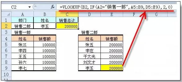 =VLOOKUP(B2,IF(A2="销售一部",A5:B9,D5:E9),2,0)