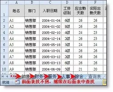 =IFERROR(VLOOKUP(A2,服务!A:G,7,0),IFERROR(VLOOKUP(A2,人事!A:G,7,0),IFERROR(VLOOKUP(A2,综合!A:G,7,0),IFERROR(VLOOKUP(A2,财务!A:G,7,0),IFERROR(VLOOKUP(A2,销售!A:G,7,0),"无此人信息")))))