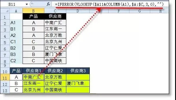 B11=IFERROR(VLOOKUP($A11&COLUMN(A1),$A:$C,3,0),"")