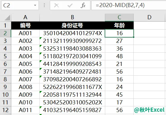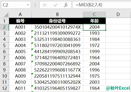 Mid 函数可以在身份证号码中,从第 7 位开始提取 4 位,这样就得到了出生年份。
