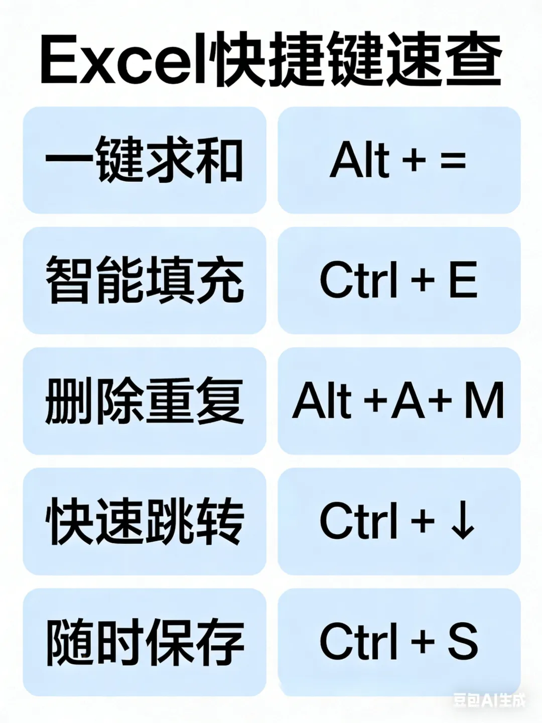 大家好,今天给大家分享职场人最实用的 Excel 技巧。不用记复杂公式,只要记住这5 个快捷键,效率直接翻倍,加班都比别人少。不管你是文员、会计、行政、销售,还是刚入职的新人,都能用得上。1. 一键求和:Alt + =