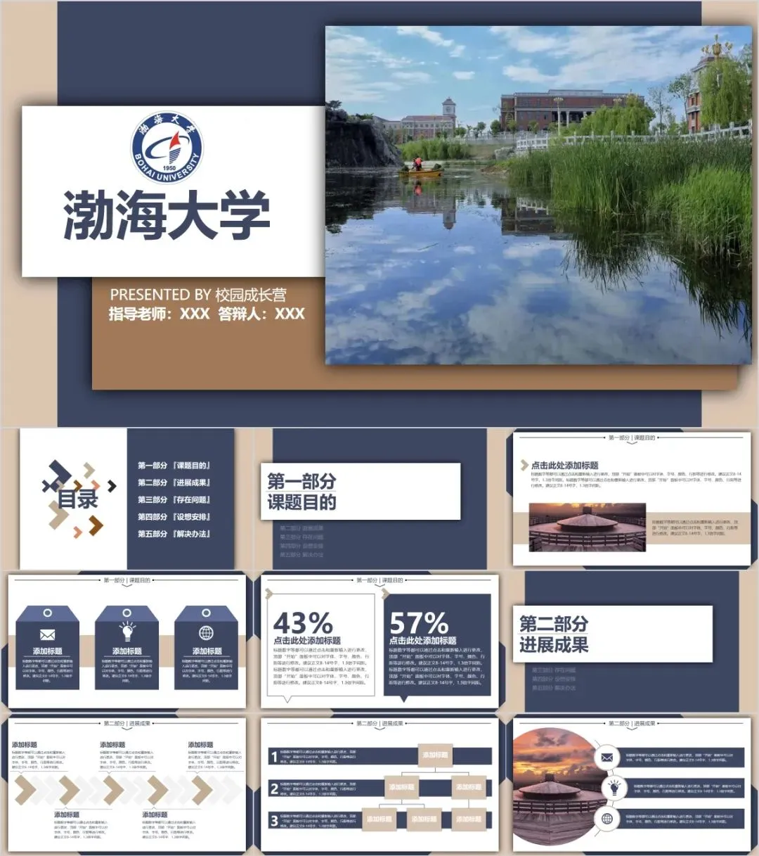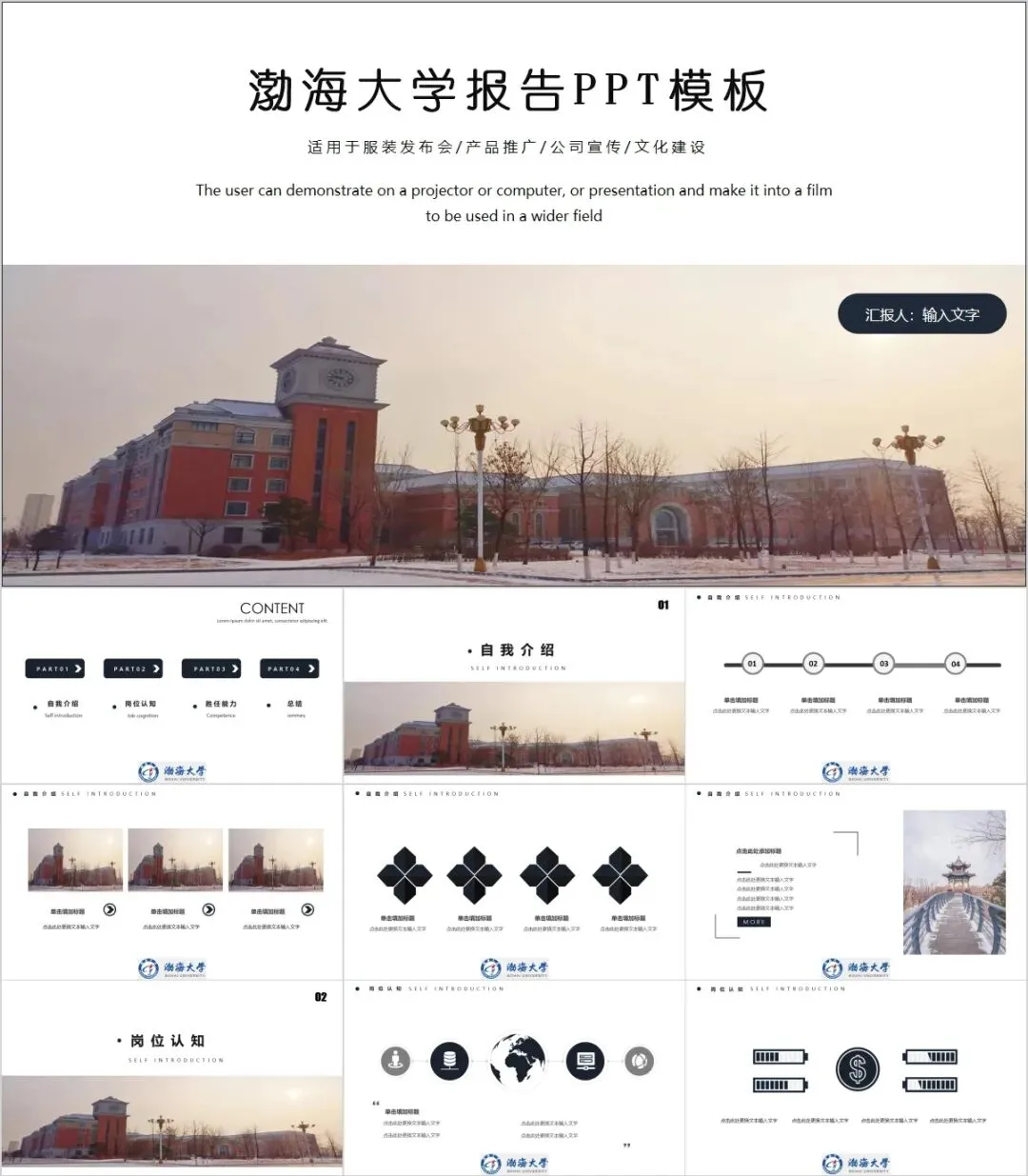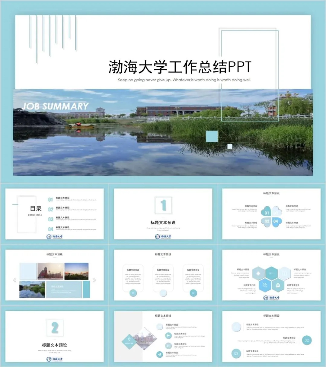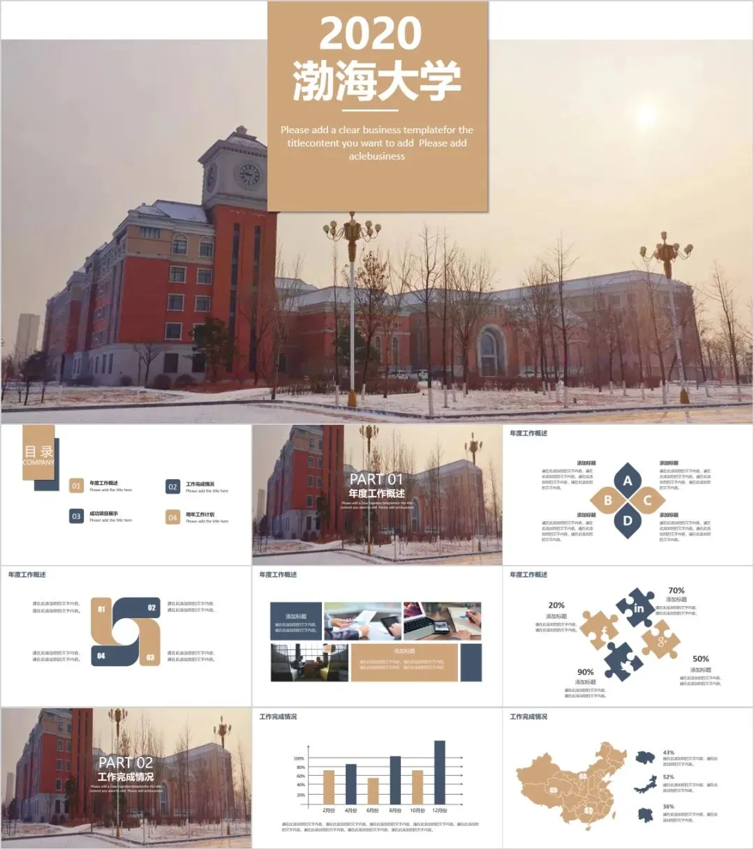 以上是我们为大家准备的渤海大学专属PPT模板,文中的所有板式都是可编辑的,大家可以上传替换自己喜欢的校园美景,做出具有自己风格的专属PPT哦!