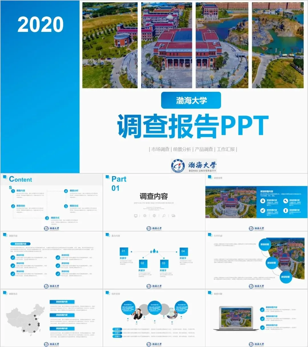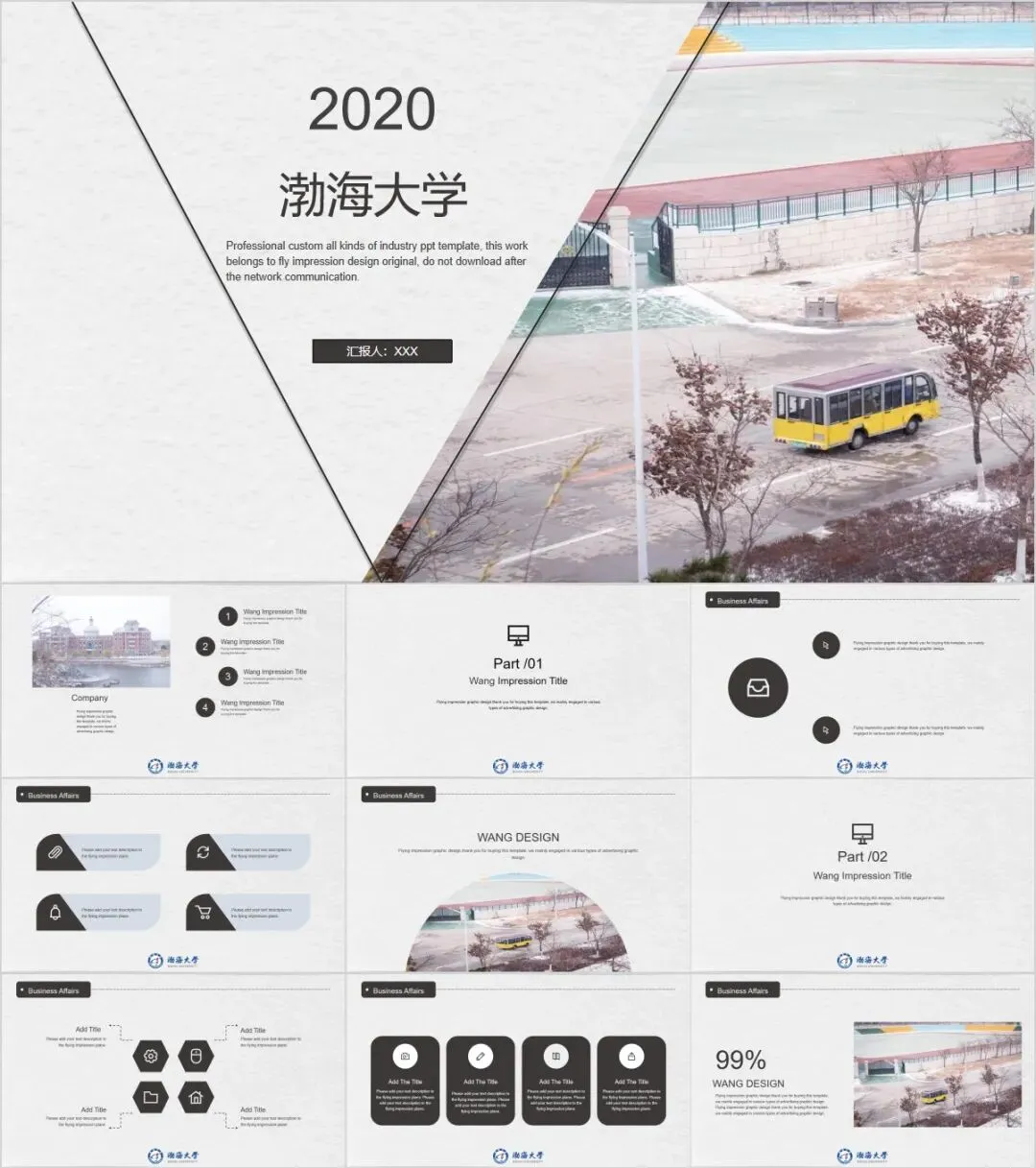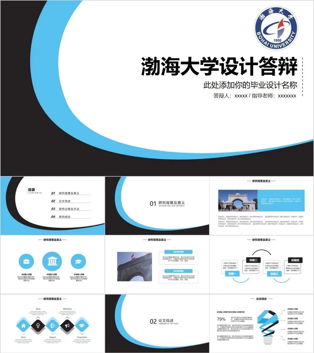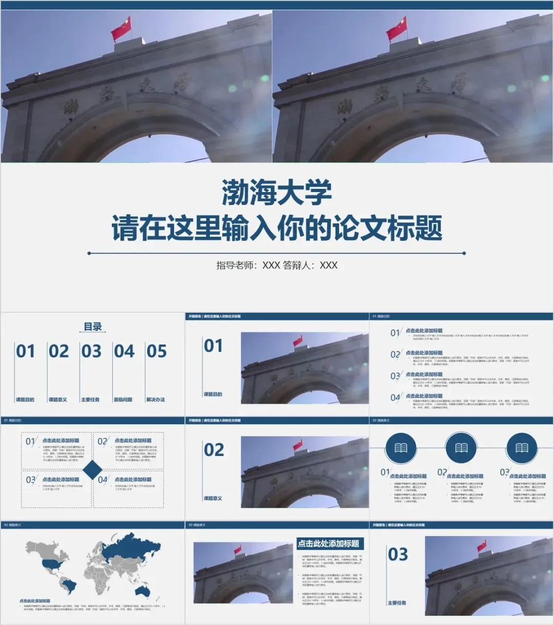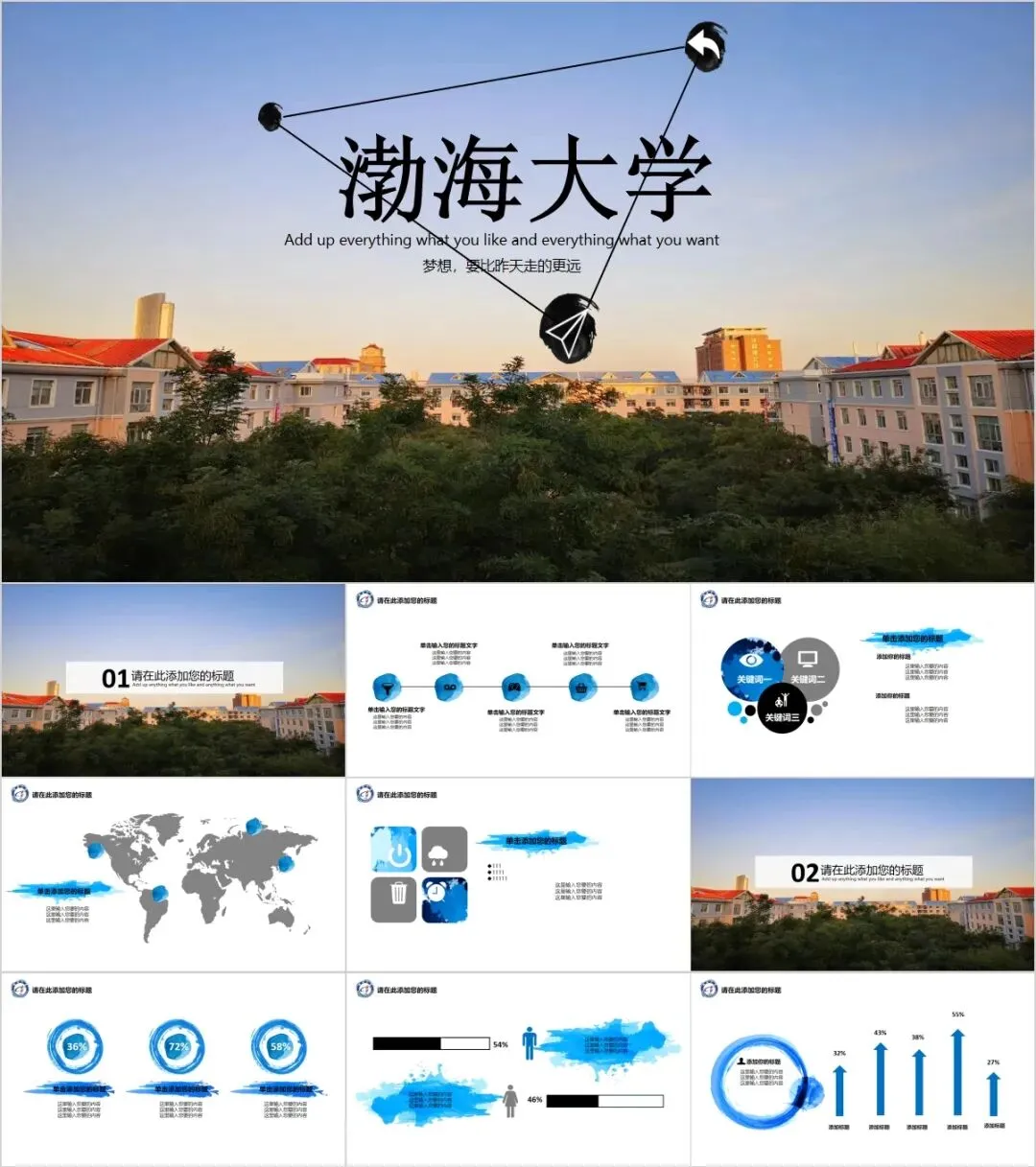 以上是我们为大家准备的渤海大学专属PPT模板,文中的所有板式都是可编辑的,大家可以上传替换自己喜欢的校园美景,做出具有自己风格的专属PPT哦!