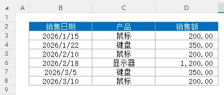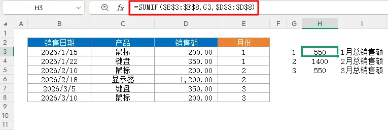 =MONTH(B3) ,向下填充,将销售日期对应的月份提取出来。=SUMIF($E$3:$E$8,G3,$D$3:$D$8)Month(2026,3,11),Excel无法识别。正确的做法是引用包含日期的单元格,或者将日期用双引号括起来,如MONTH("2026-3-11")。