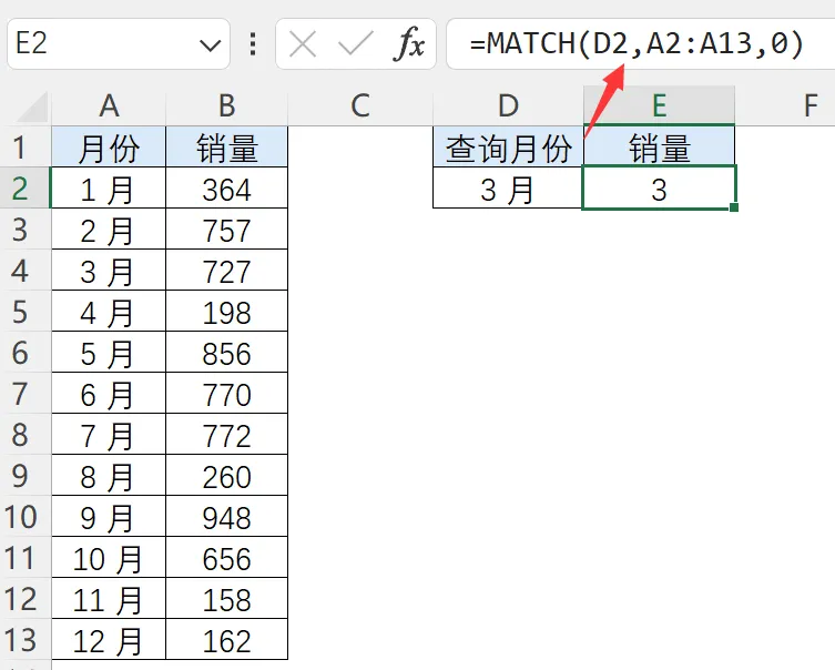 由于 “3 月” 在 A2:A13 列区域中的相对位置是第 3 位,所以 “MATCH(D2,A2:A13,0)” 返回的结果为 3。
