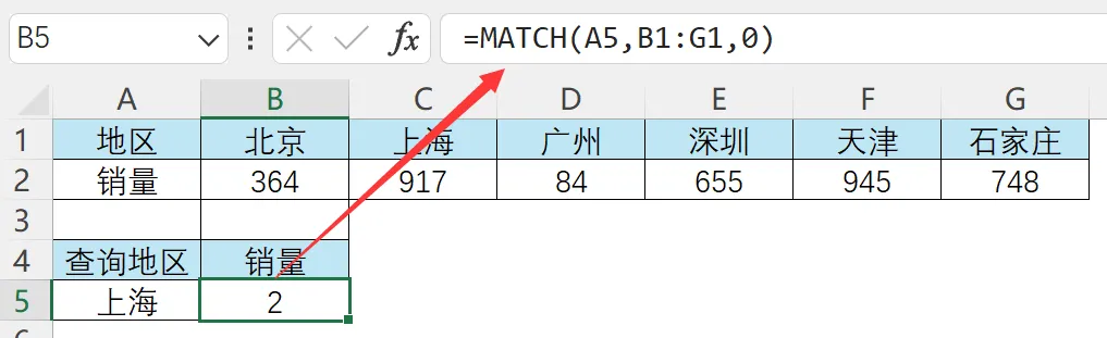 由于 “上海” 在 B1:G1 行区域中的相对位置是第 2 位,所以公式返回结果为 2。