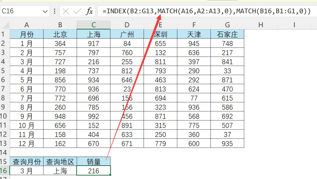 ①使用 “MATCH (A16,A2:A13,0)” 根据月份条件定位目标数据所在的行位置;