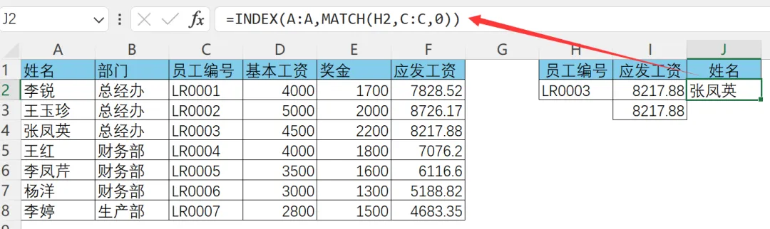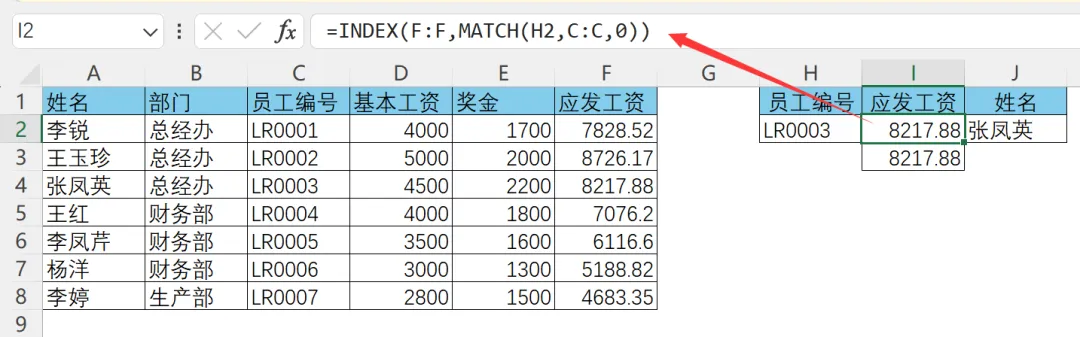 公式中的 “C:C” 代表整个 C 列,“F:F” 代表整个 F 列,首先用 MATCH 函数在 C 列中定位员工编号所在的行号位置,然后传递给 INDEX 函数返回对应的 F 列的应发工资。