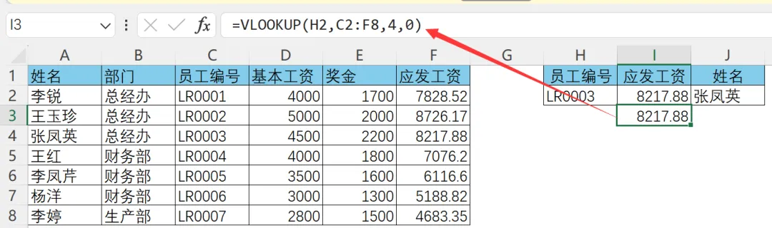 此案例也可以使用 VLOOKUP 函数查询,如下图所示。