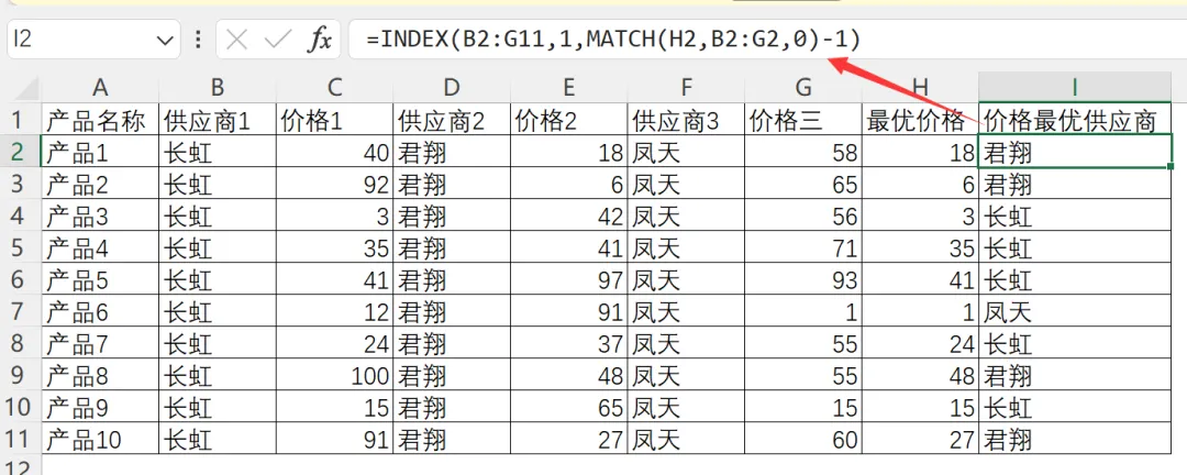 这2个函数的组合如果学熟练了,很多数据的整理就能方便很多。比如,在做比价的时候,报价的有3家供应商,各自有一列价格,这时候,如果我们要很快统计出价格最优的供应商和最优价格,就可以用INDEX,MATCH的组合,很快列出最优价格,以及最优价格对应的供应商,而不用一个个做对比,然后再一个个去选择对应的供应商。如下图所示。