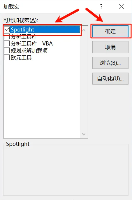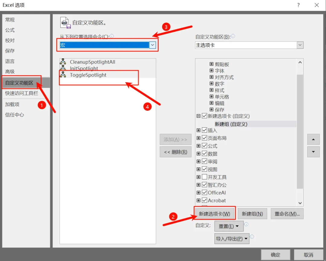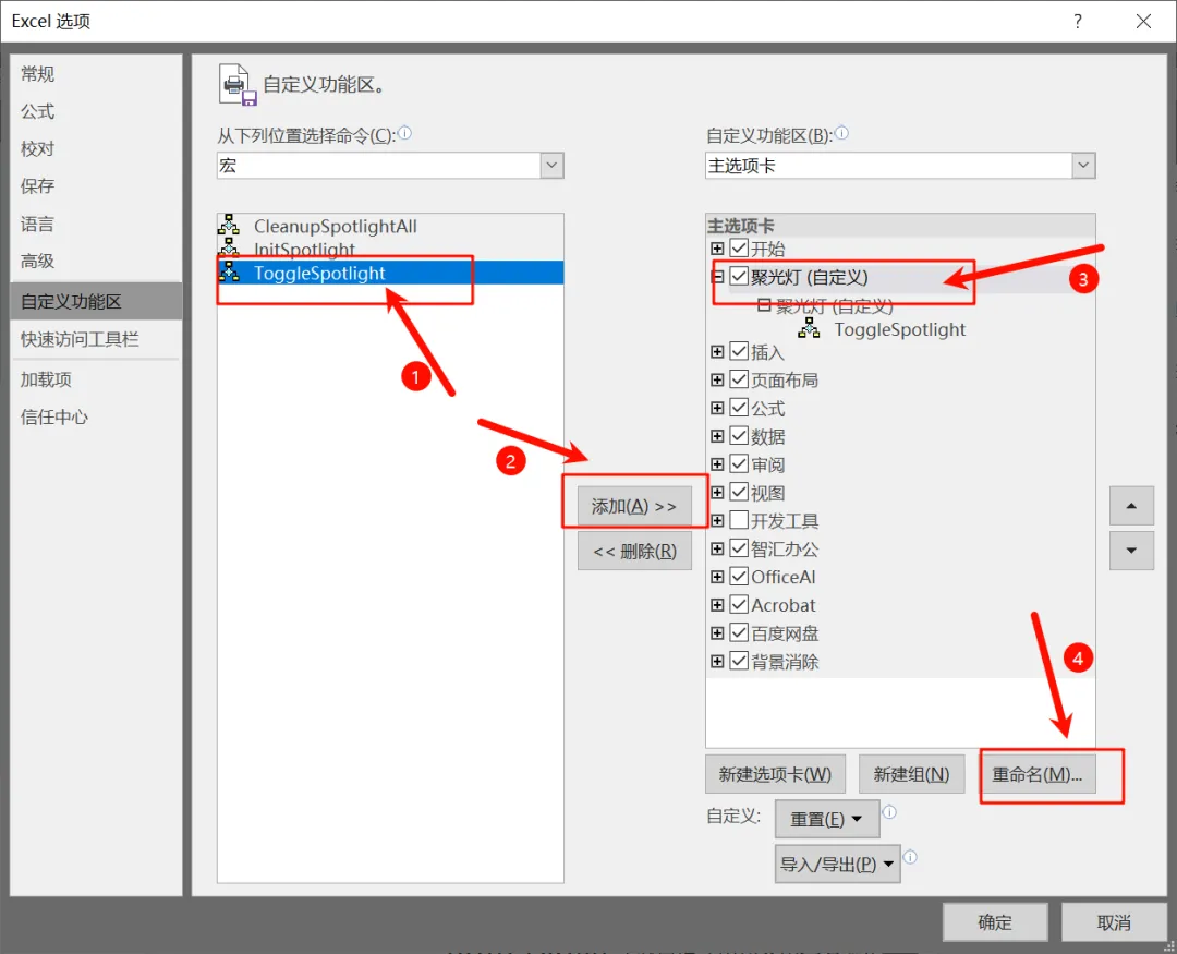 2.打开excel,选择“文件”→“选项”→“加载项”→“excel加载项”→“转到”4.然后,点击选择“文件”→“选项”→“自定义功能区”→“新建选项卡”,在最上方的“选择命令框内”下拉选择“宏”,点击“togglespotlight”。5.选中“togglespotlight”后,点击“添加”。选中右侧刚刚新建的新建选项卡,点击右下角“重命名”或者直接在选项卡上右键重命名为聚光灯。点击下方“确定”按钮退出当前窗口。6.这时候你的excel顶部的菜单栏就会出现一个“聚光灯”选项卡,点击里面的“togglespotlight”图标即可打开或关闭聚光灯功能。有了此款插件,即使用的不是office365版本,也可以使用聚光灯功能了。好了,今天这款office聚光灯插件就介绍到这里了,点个赞,点个在看,需要别的软件在下面留言,本期软件免费获取在下方。下载地址:https://pan.baidu.com/s/1oKG5AFkaaQjWef7ENazevg?pwd=gcic点击名片关注上面公众号不会科技,获取更多软件资讯