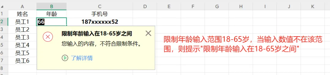 如下图,要求年龄在18-65岁之间,如果超出该范围则提示“限制年龄输入在18-65岁之间”。