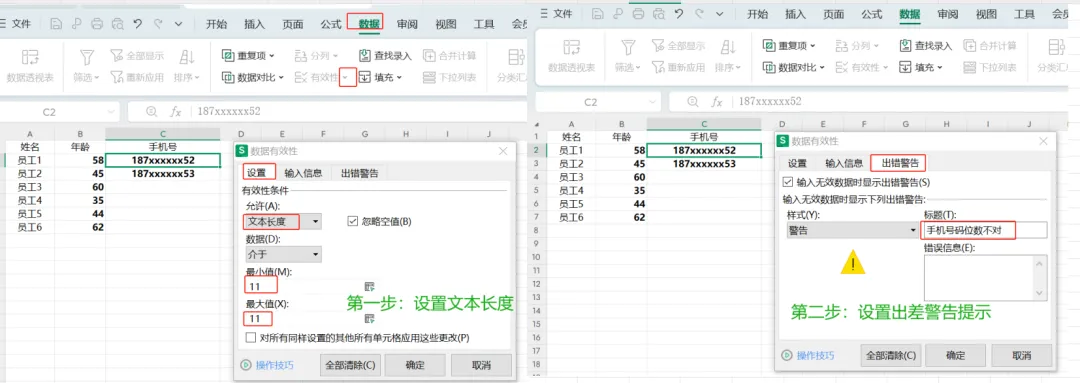 设置操作与限制数字基本一致,只是在第一步设置范围的时候,选择文本长度,第二步出错警告信息输入"手机号位数不对",操作如下: