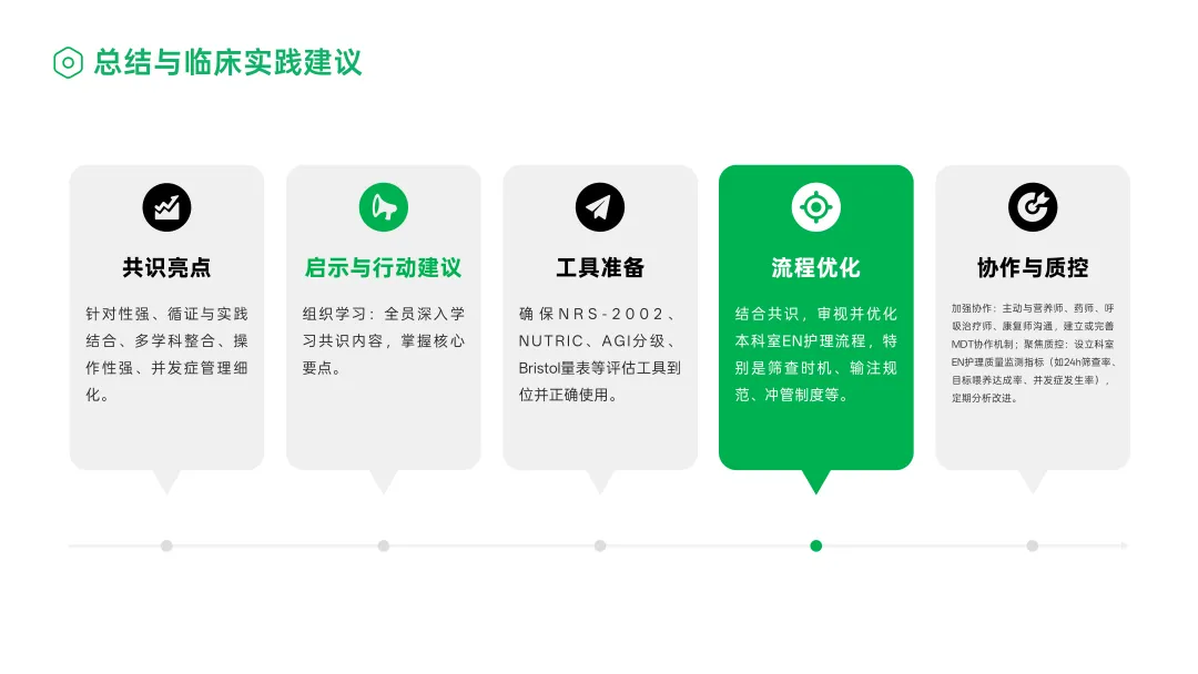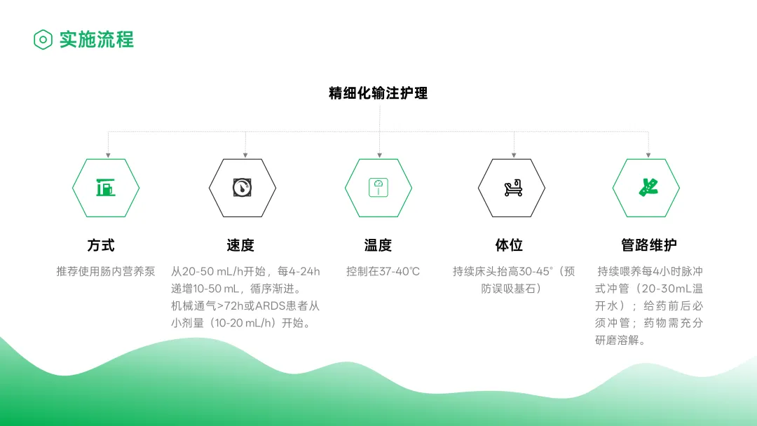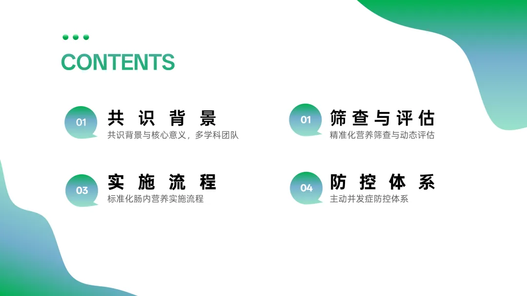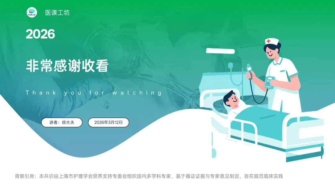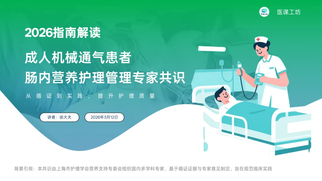 嗨,我是医课工坊「徐医生」,专注于做好看的医学PPT。这里有实用原创医疗 PPT 资源,帮你把复杂的医学知识讲得更清楚、更动人。如果你也在寻找让课件“活”起来的方法——关注我,一起做更会表达的医者。大家好,我是医课工坊·全科徐大夫。今天我给大家带来《成人机械通气患者肠内营养护理管理专家共识》2026指南解读PPT。本共识由多学科专家基于循证与意见制定,旨在规范实践、提升护理质量。下面我开始详细讲解。本次培训设定了四个核心目标:首先是明确机械通气患者肠内营养支持的关键作用;其次理解共识背景和意义,为后续实践提供理论依据;接着掌握管理框架,熟悉多学科团队等五大核心维度;最后应用护理要点,推动科室肠内营养护理向科学管理转变,全面提升护理质量。本次分享聚焦成人机械通气患者肠内营养护理管理。涵盖四大关键板块:共识背景,阐述意义与多学科团队;实施流程,强调标准化;筛查与评估,突出精准化动态评估;防控体系,介绍主动并发症防控措施,助大家全面掌握管理要点。本次共识背景聚焦核心意义与多学科团队构建。在机械通气患者EN护理管理领域,现状挑战重重。而构建多学科营养支持合作团队(MDT),能让管理从单一执行迈向跨专业协同,为解决问题奠定坚实基础。机械通气患者肠内营养(EN)实施难题凸显,喂养不耐受发生率高达80.2% - 85.0%,且国内外缺乏相关护理管理规范。本共识基于最新循证,结合国情构建全流程体系,填补国内空白,旨在降低并发症、提高护理质量、改善患者预后。肠内营养(EN)管理正从单一执行迈向跨专业协同,构建多学科营养支持合作团队(MDT)至关重要。临床医生、营养师、护士等各成员分工明确,发挥专业优势。同时,建议成立专项质控小组,实施全程质量控制,形成PDCA循环,保障EN管理质量。精准化营养风险筛查与动态评估,是机械通气患者肠内营养支持的关键环节。通过精准筛查,能识别高风险人群;动态评估可依据患者状况调整方案。做好这两点,能为患者提供更精准的营养支持,改善临床结局。精准化营养风险筛查很重要。NUTRIC评分含关键指标,与蛋白和能量供给不足关联强,适合ICU患者。推荐NRS - 2002与NUTRIC结合,保障筛查全面准确。评估要在入院24小时内完成并每周复评,精准锁定需营养干预者,改善临床结局。深度营养状态动态评估中,代谢需求评估很关键。热量评估金标准是间接测热法,无条件时按25 - 30 kcal/kg·d估算并依情况调整。蛋白质方面,常规1.2 - 2.0 g/kg·d,不同情况用量有别,如脓毒症、肾功能不全等。深度营养状态动态评估可借助实验室指标。急性期蛋白方面,CRP高提示高炎症,要降低热量目标;IL - 6高则蛋白需求增20%。营养标志物中,前白蛋白低是重度营养不良,纤维连接蛋白低示修复延迟。代谢指标里,血糖要控制,血乳酸高时EN需谨慎。深度营养状态动态评估中,胃肠功能评估至关重要,采用AGI分级系统是决定EN启动的关键。若评估为I - II级,可启动EN;III级则从小剂量尝试并密切观察;IV级需先处理胃肠损伤,延迟EN启动,以保障营养支持安全有效。标准化肠内营养实施流程至关重要。此前我们讨论了营养筛查、评估等内容,此流程是衔接这些环节,将理论落实到实践的关键。它能确保肠内营养实施更规范、科学,为患者提供更有效的营养支持。肠内营养实施时机为患者入住ICU后24 - 48小时且血流动力学稳定时。在喂养途径上,无创通气患者适用经口喂养/ONS;胃肠功能好的短期EN患者可用鼻胃管;胃瘫等患者用鼻空肠管;长期EN患者则选造瘘管,各有适配。营养制剂选择需因人而异。胃肠道功能正常者,选标准整蛋白配方,可提供蛋白质支持,维持代谢。胃肠不耐受或吸收障碍者,短肽配方易吸收。需限液者,高密度配方能少液供能。糖尿病患者,特异性配方可稳定血糖。精细化输注护理至关重要。方式上推荐用肠内营养泵。速度方面,一般从20 - 50 mL/h起,每4 - 24h递增10 - 50 mL,特殊患者从小剂量10 - 20 mL/h开始。温度控制在37 - 40℃,体位要床头抬高30 - 45°防误吸,管路维护也得做好。前面我们详细了解了肠内营养的实施流程,包括时机、制剂选择和输注护理等方面。接下来,我们将进入一个新的重要环节——主动并发症防控体系。这一体系就像一道防线,能保障肠内营养实施的安全。后续我们会看到具体的并发症防控策略。本共识构建了主动并发症防控体系,聚焦腹胀、腹泻、堵管、误吸、恶心/呕吐、代谢紊乱及再喂养综合征六大常见并发症,为每种并发症都制定了“预防 - 处置”策略,为临床应对提供了有效指导。主动并发症防控中,腹胀可阶梯式喂养、监测肠鸣音与腹内压预防,处置时可减慢速度、用促动力药,严重时暂停EN并胃肠减压;恶心呕吐可渐进式喂养、监测胃残余量预防,处置要侧头防误吸、清理气道、用止吐药;腹泻需无菌操作、阶梯喂养等,处置要与医生决策、调整参数、用止泻药并加强肛周护理。主动并发症防控中,误吸最凶险,预防要床头抬高、用营养泵等,处置需停EN、气道吸引等;代谢紊乱/再喂养综合征,高危者从低热量开始、补元素,处置要减缓/暂停EN、补电解质;堵管预防要规范冲管,处置用温水冲洗,禁暴力通管。本次共识亮点颇多,针对性强、循证与实践结合等。在临床实践中,要加强协作,建立MDT机制,聚焦质控设监测指标。同时,结合共识优化护理流程,组织