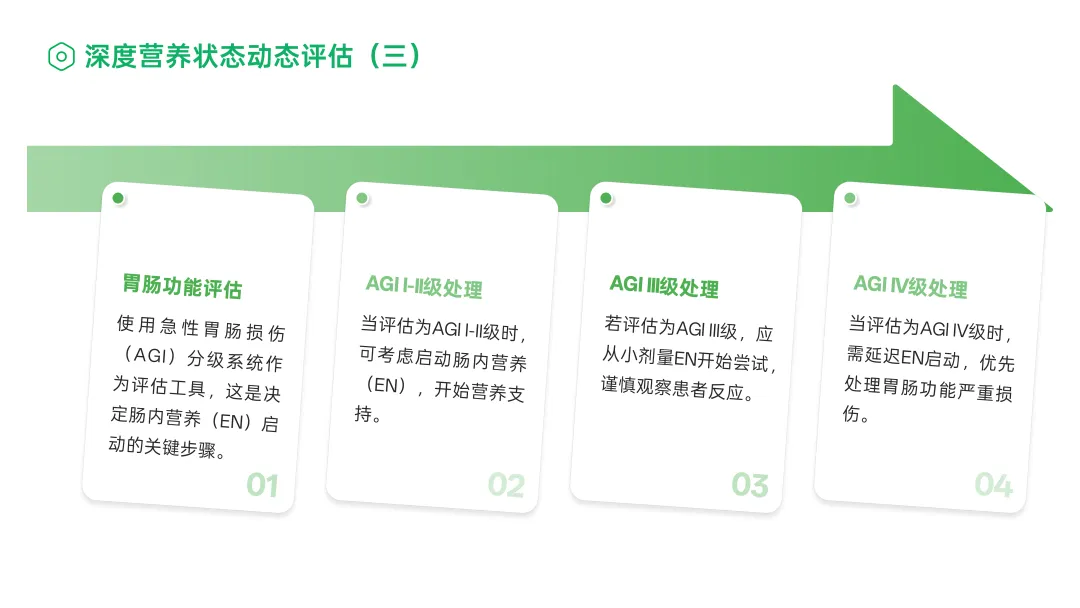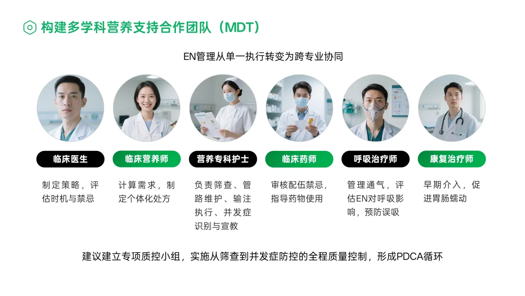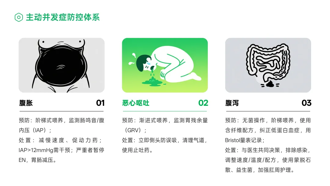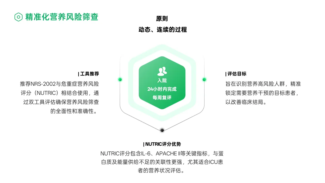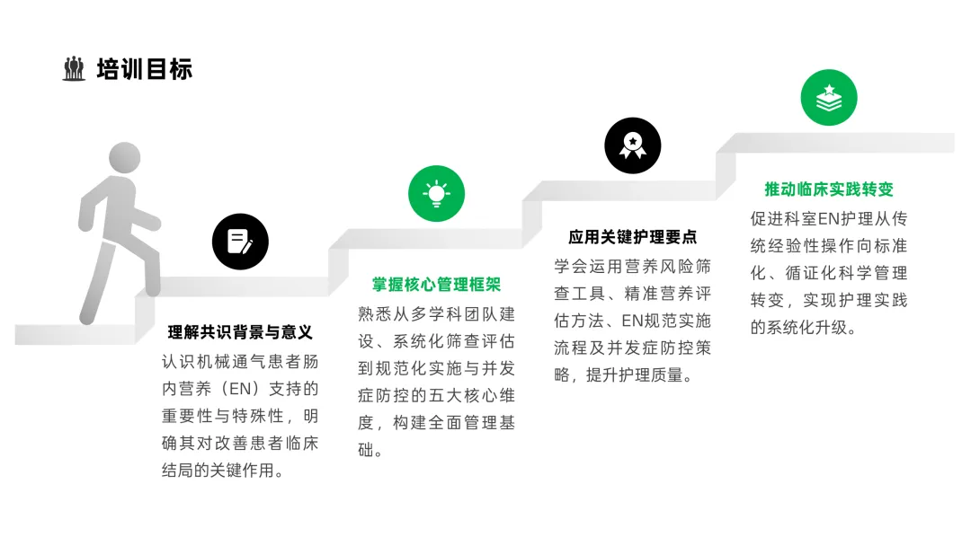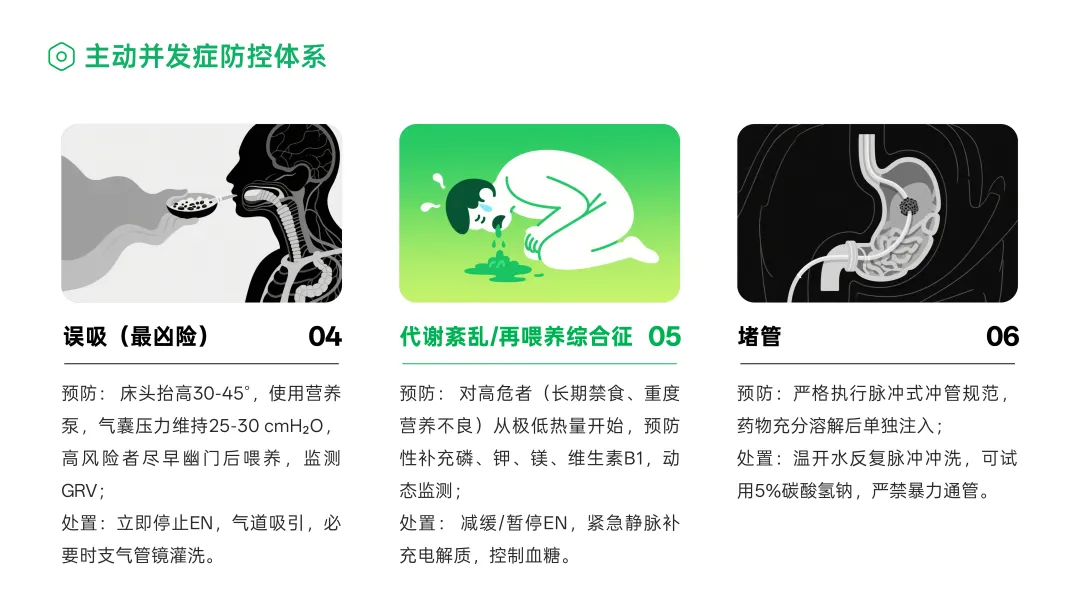嗨,我是医课工坊「徐医生」,专注于做好看的医学PPT。这里有实用原创医疗 PPT 资源,帮你把复杂的医学知识讲得更清楚、更动人。如果你也在寻找让课件“活”起来的方法——关注我,一起做更会表达的医者。大家好,我是医课工坊·全科徐大夫。今天我给大家带来《成人机械通气患者肠内营养护理管理专家共识》2026指南解读PPT。本共识由多学科专家基于循证与意见制定,旨在规范实践、提升护理质量。下面我开始详细讲解。本次培训设定了四个核心目标:首先是明确机械通气患者肠内营养支持的关键作用;其次理解共识背景和意义,为后续实践提供理论依据;接着掌握管理框架,熟悉多学科团队等五大核心维度;最后应用护理要点,推动科室肠内营养护理向科学管理转变,全面提升护理质量。本次分享聚焦成人机械通气患者肠内营养护理管理。涵盖四大关键板块:共识背景,阐述意义与多学科团队;实施流程,强调标准化;筛查与评估,突出精准化动态评估;防控体系,介绍主动并发症防控措施,助大家全面掌握管理要点。本次共识背景聚焦核心意义与多学科团队构建。在机械通气患者EN护理管理领域,现状挑战重重。而构建多学科营养支持合作团队(MDT),能让管理从单一执行迈向跨专业协同,为解决问题奠定坚实基础。机械通气患者肠内营养(EN)实施难题凸显,喂养不耐受发生率高达80.2% - 85.0%,且国内外缺乏相关护理管理规范。本共识基于最新循证,结合国情构建全流程体系,填补国内空白,旨在降低并发症、提高护理质量、改善患者预后。肠内营养(EN)管理正从单一执行迈向跨专业协同,构建多学科营养支持合作团队(MDT)至关重要。临床医生、营养师、护士等各成员分工明确,发挥专业优势。同时,建议成立专项质控小组,实施全程质量控制,形成PDCA循环,保障EN管理质量。精准化营养风险筛查与动态评估,是机械通气患者肠内营养支持的关键环节。通过精准筛查,能识别高风险人群;动态评估可依据患者状况调整方案。做好这两点,能为患者提供更精准的营养支持,改善临床结局。精准化营养风险筛查很重要。NUTRIC评分含关键指标,与蛋白和能量供给不足关联强,适合ICU患者。推荐NRS - 2002与NUTRIC结合,保障筛查全面准确。评估要在入院24小时内完成并每周复评,精准锁定需营养干预者,改善临床结局。深度营养状态动态评估中,代谢需求评估很关键。热量评估金标准是间接测热法,无条件时按25 - 30 kcal/kg·d估算并依情况调整。蛋白质方面,常规1.2 - 2.0 g/kg·d,不同情况用量有别,如脓毒症、肾功能不全等。深度营养状态动态评估可借助实验室指标。急性期蛋白方面,CRP高提示高炎症,要降低热量目标;IL - 6高则蛋白需求增20%。营养标志物中,前白蛋白低是重度营养不良,纤维连接蛋白低示修复延迟。代谢指标里,血糖要控制,血乳酸高时EN需谨慎。深度营养状态动态评估中,胃肠功能评估至关重要,采用AGI分级系统是决定EN启动的关键。若评估为I - II级,可启动EN;III级则从小剂量尝试并密切观察;IV级需先处理胃肠损伤,延迟EN启动,以保障营养支持安全有效。标准化肠内营养实施流程至关重要。此前我们讨论了营养筛查、评估等内容,此流程是衔接这些环节,将理论落实到实践的关键。它能确保肠内营养实施更规范、科学,为患者提供更有效的营养支持。肠内营养实施时机为患者入住ICU后24 - 48小时且血流动力学稳定时。在喂养途径上,无创通气患者适用经口喂养/ONS;胃肠功能好的短期EN患者可用鼻胃管;胃瘫等患者用鼻空肠管;长期EN患者则选造瘘管,各有适配。营养制剂选择需因人而异。胃肠道功能正常者,选标准整蛋白配方,可提供蛋白质支持,维持代谢。胃肠不耐受或吸收障碍者,短肽配方易吸收。需限液者,高密度配方能少液供能。糖尿病患者,特异性配方可稳定血糖。精细化输注护理至关重要。方式上推荐用肠内营养泵。速度方面,一般从20 - 50 mL/h起,每4 - 24h递增10 - 50 mL,特殊患者从小剂量10 - 20 mL/h开始。温度控制在37 - 40℃,体位要床头抬高30 - 45°防误吸,管路维护也得做好。前面我们详细了解了肠内营养的实施流程,包括时机、制剂选择和输注护理等方面。接下来,我们将进入一个新的重要环节——主动并发症防控体系。这一体系就像一道防线,能保障肠内营养实施的安全。后续我们会看到具体的并发症防控策略。本共识构建了主动并发症防控体系,聚焦腹胀、腹泻、堵管、误吸、恶心/呕吐、代谢紊乱及再喂养综合征六大常见并发症,为每种并发症都制定了“预防 - 处置”策略,为临床应对提供了有效指导。主动并发症防控中,腹胀可阶梯式喂养、监测肠鸣音与腹内压预防,处置时可减慢速度、用促动力药,严重时暂停EN并胃肠减压;恶心呕吐可渐进式喂养、监测胃残余量预防,处置要侧头防误吸、清理气道、用止吐药;腹泻需无菌操作、阶梯喂养等,处置要与医生决策、调整参数、用止泻药并加强肛周护理。主动并发症防控中,误吸最凶险,预防要床头抬高、用营养泵等,处置需停EN、气道吸引等;代谢紊乱/再喂养综合征,高危者从低热量开始、补元素,处置要减缓/暂停EN、补电解质;堵管预防要规范冲管,处置用温水冲洗,禁暴力通管。本次共识亮点颇多,针对性强、循证与实践结合等。在临床实践中,要加强协作,建立MDT机制,聚焦质控设监测指标。同时,结合共识优化护理流程,组织