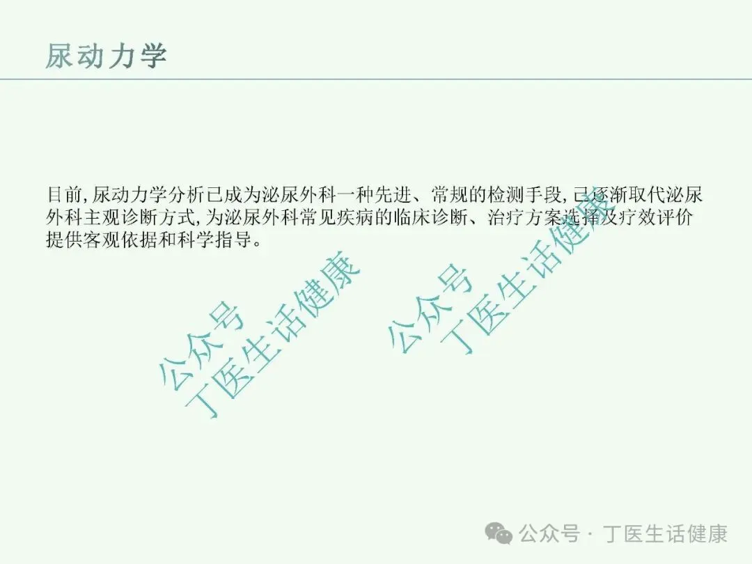 目前,尿动力学分析已成为泌尿外科一种先进、常规的检测手段,已逐渐取代泌尿外科主观诊断方式,为泌尿外科常见疾病的临床诊断、治疗方案选择及疗效评价提供客观依据和科学指导。(PPT下载链接见文末)免责声明 尊重原创,乐于分享!内容通过公开合法渠道获取。创作以上PPT供免费全文阅读,学习交流,无任何商业目的,文字内容版权归原作者及出版社所有,已尽量标注来源,如有侵犯您的权益请及时告知,将在24小时内删除。请尊重版权方知识产权,支持版权方及出版社,文档供学习交流,请勿商用,谢谢。原版可编辑PPT:请关注后发送消息:“尿动力”,获取网盘下载链接。