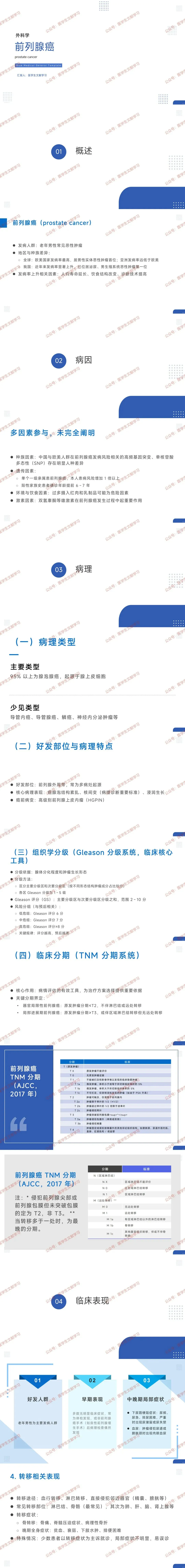 - 关键界定:器官局限性前列腺癌(原发肿瘤≤T2,无淋巴结 / 远处转移);局部进展期前列腺癌(原发肿瘤≥T3,或伴区域淋巴结转移无远处转移);远处转移包括淋巴结外转移、骨转移、其他器官转移。