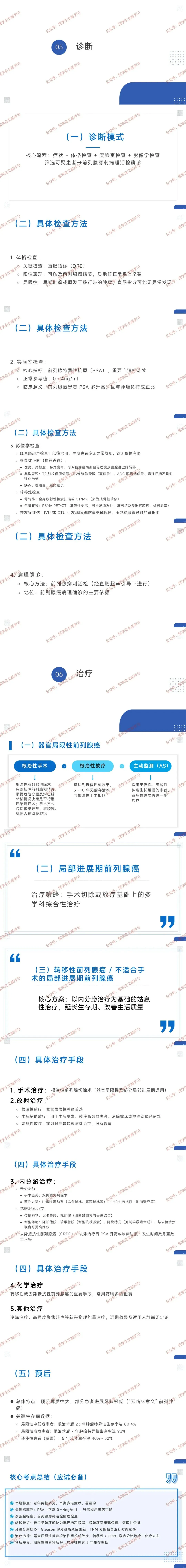 - 治疗选择:器官局限性首选根治性手术或放疗,转移性 / CRPC 以内分泌治疗、化疗为主。